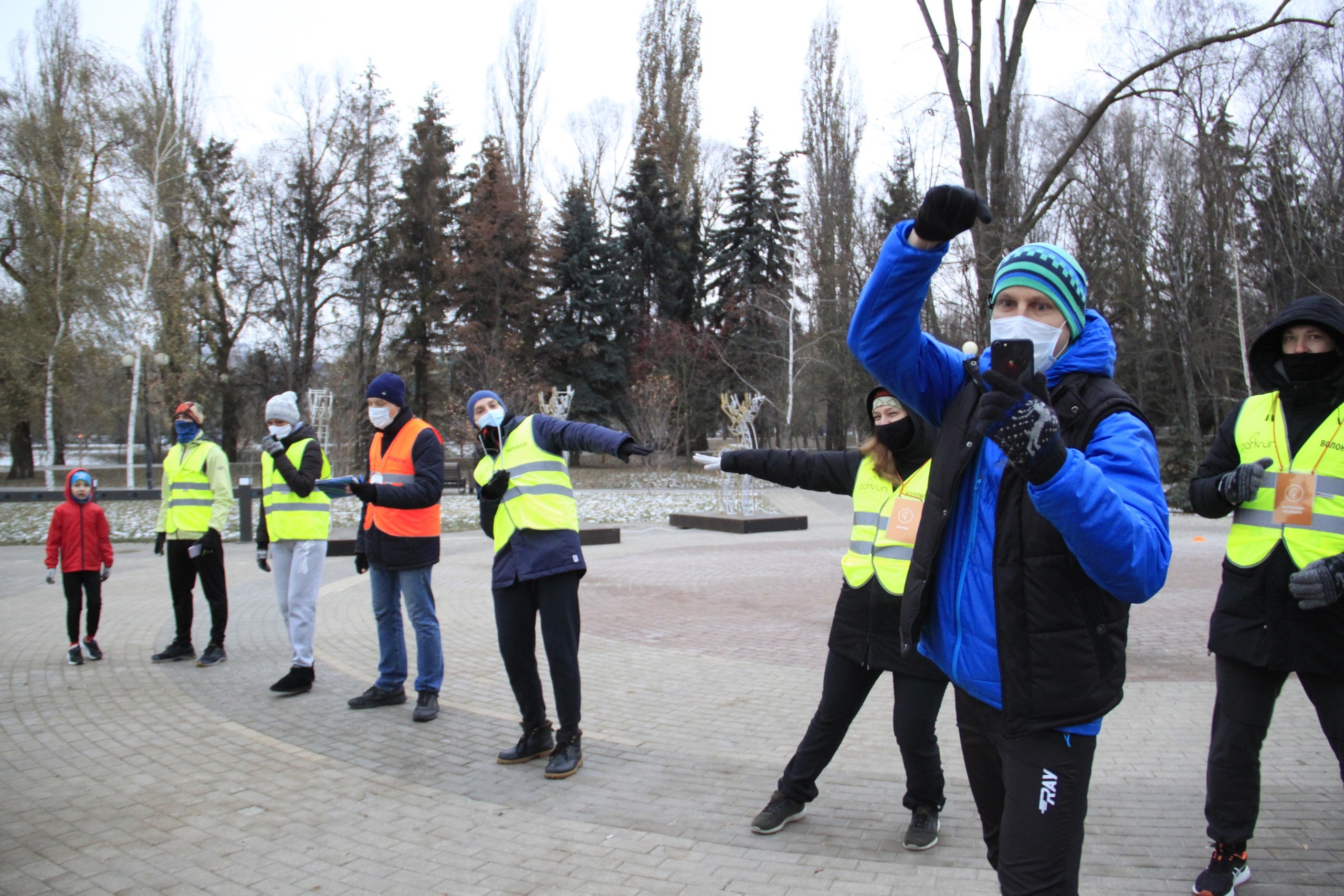 parkrun вернулся, как мы уже сказали, с дополнениями к правилам. Как раз одно из них: социальную дистанцию - демонстрируют волонтёры на брифинге.