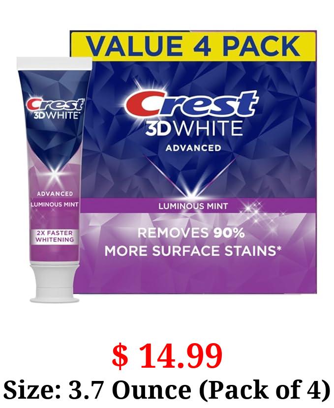 $ 14.99 Size: 3.7 Ounce (Pack of 4) Crest 3D White Advanced Luminous Mint Teeth Whitening Toothpaste, 3.7 oz Pack of 4 - Helps Remove Surface Stains, Whitens Teeth, Strengthens Tooth Enamel, Protects Against Cavities