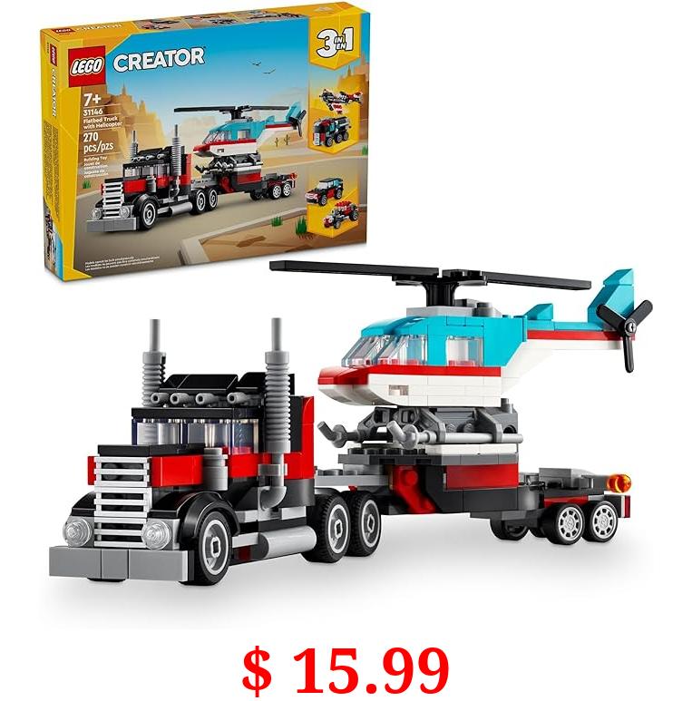 $ 15.99 LEGO Creator 3 in 1 Flatbed Truck with Helicopter Toy, Transforms from Flatbed Truck Toy to Propeller Plane to Hot Rod and SUV Car Toys, Gift Idea for Boys and Girls Ages 7 Years Old and Up, 31146