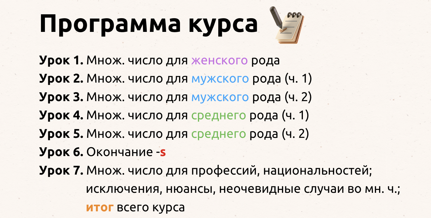 Курс посвящен пониманию формы множ. числа у существительных, почему именно такое окончание, откуда оно берется и тд.