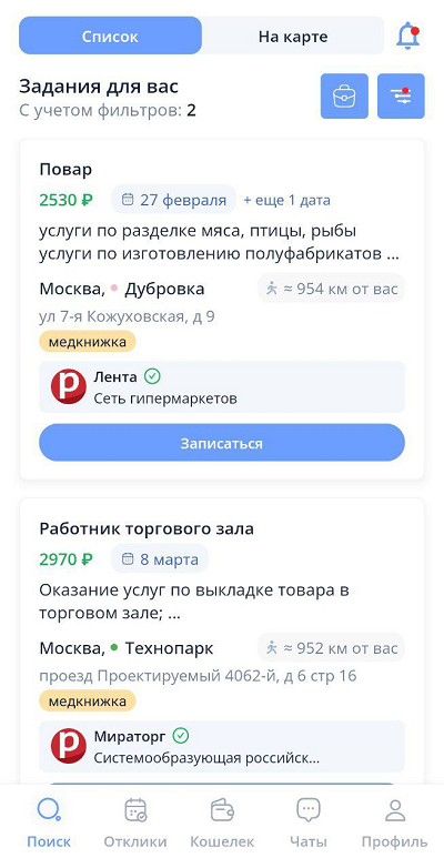 Совет: Некоторые задачи требуют медкнижку или водительские права — проверяйте описание заранее.