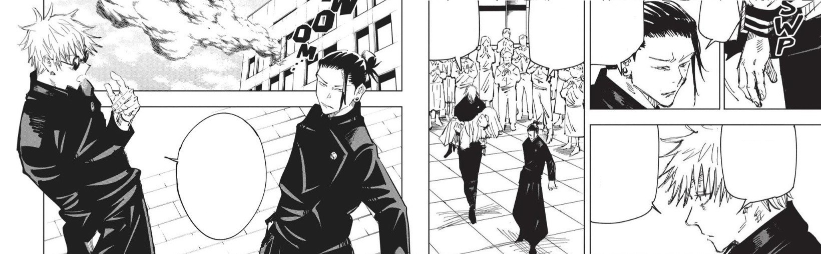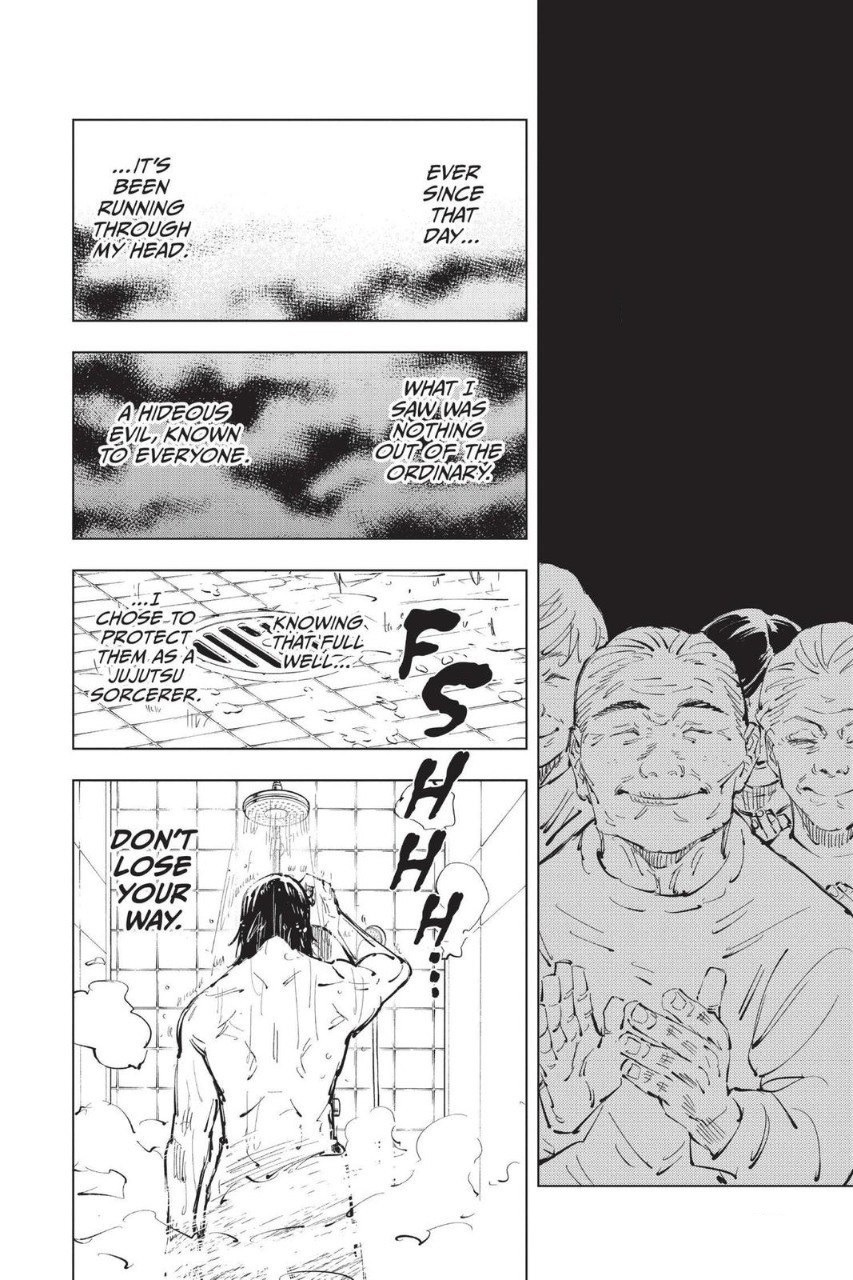 В похожую ситуацию попадает и Сугуру. Тяжёлое, одинокое лето раз за разом возвращает его к событиям годичной давности. Гэто одержим травматическими образами из прошлого: образами не-магов аплодирующих их с Сатору поражению. Люди не только не дают магам ничего взамен, но и насмехаются над ними и отрицают их, принимая за «чертовщину».
