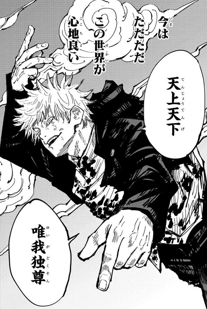 Он преследует и убивает Тодзи, но не из мести за Рико – им движет только стремление завершить бой, устранить своего соперника. В эти мгновения он отстраняется от личных привязанностей, находясь в эйфории от раскрытия новых граней техники Безграничности. Годзё рождается заново, как всемогущий маг. Слова, которые произносит Сатору, сопоставляют его с новорожденным Буддой (ссылка на тот самый пост) и он буквально становится наказанием для Тодзи, совершившего богохульство.