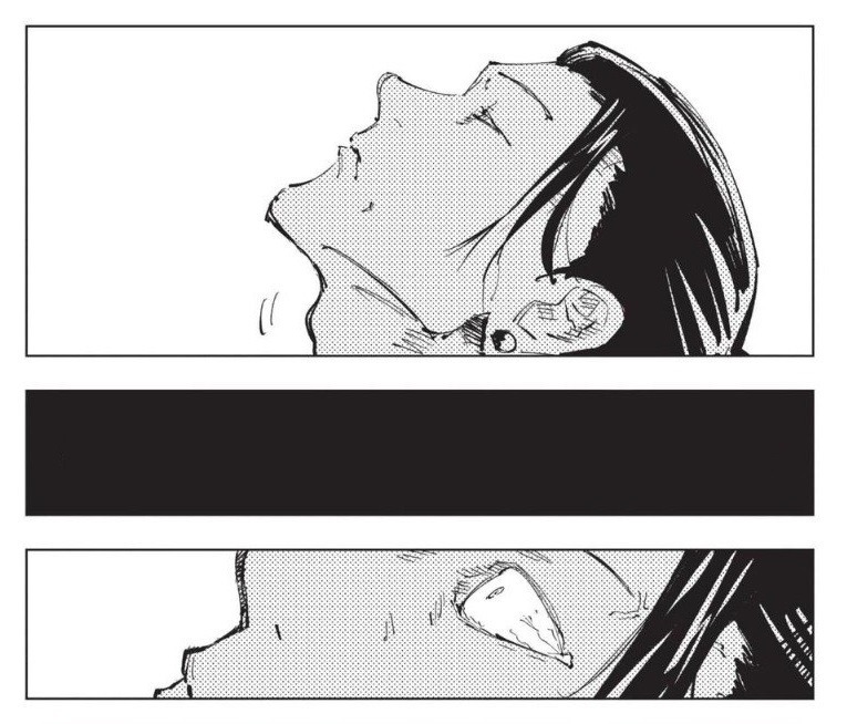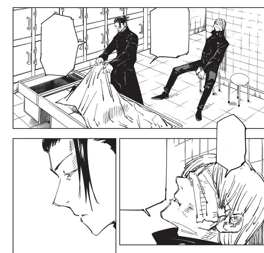 Теперь Сатору действительно берёт на себя ответственность за её смерть. Эта сцена сильно диссонирует с той, где Годзё в шутку спрашивает: «Слышь, а если та девка уже мертва, чё нам за это будет?»
