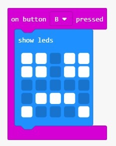 Добавьте блоки on button pressed и show leds и нарисуйте грустный смайлик при нажатии кнопки B .