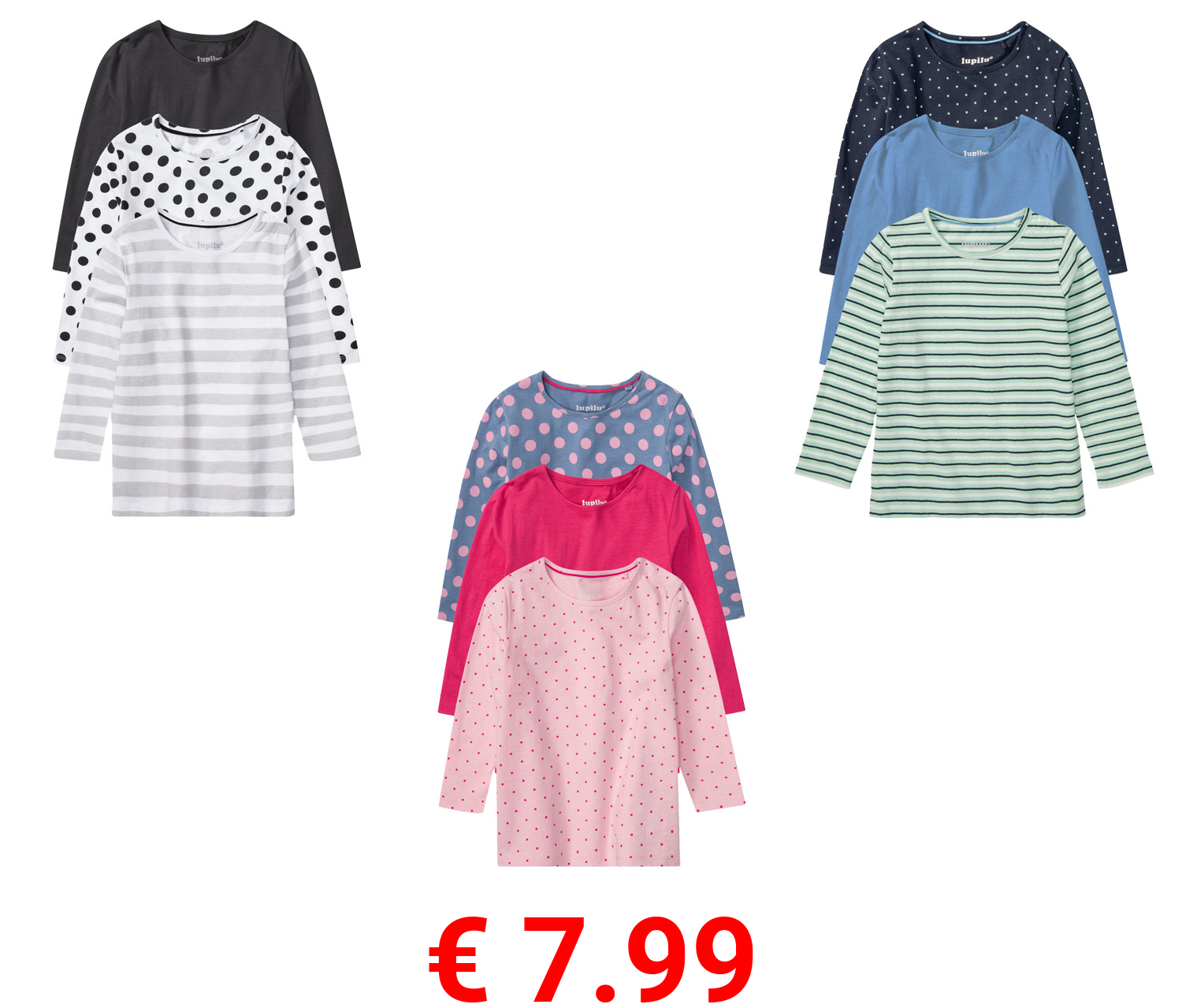 € 7.99 lupilu® Kleinkinder Mädchen Langarmshirt, 3 Stück, mit Rundhalsausschnitt