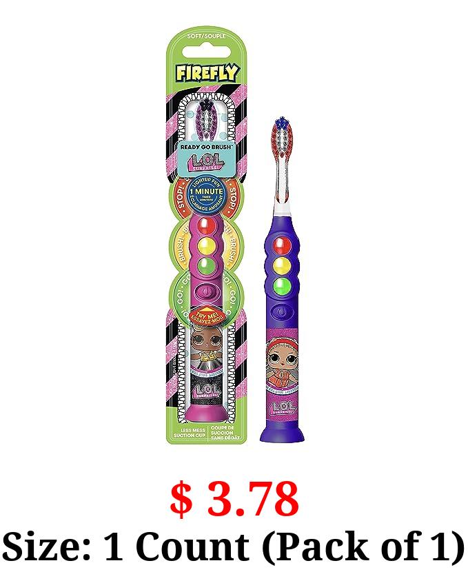 $ 3.78 Size: 1 Count (Pack of 1) Firefly Ready Go Light Up Timer Toothbrush, L.O.L. Surprise!, Premium Soft Bristles, 1 Minute Timer, Less Mess Suction Cup, Battery Included, Easy Storage, Dentist Recommended, Ages 3+, 1 Pack