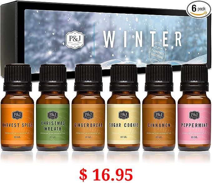 $ 16.95 P&J Fragrance Oil Winter Set | Cinnamon, Gingerbread, Sugar Cookies, Harvest Spice, Peppermint, and Christmas Wreath Candle Scents for Candle Making, Freshie Scents, Soap Making Supplies