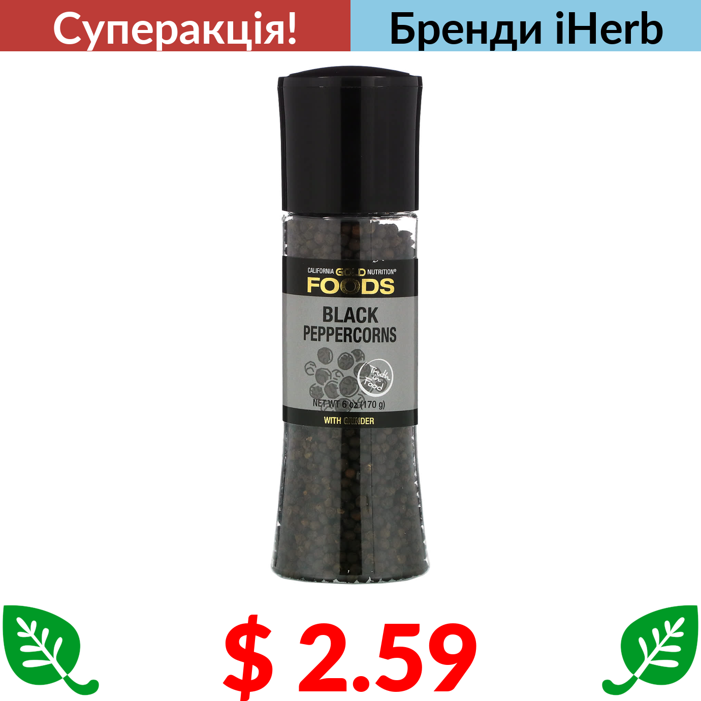 $ 2.59 California Gold Nutrition, FOODS, чорний перець горошком у млинку, 170 г (6 унцій)