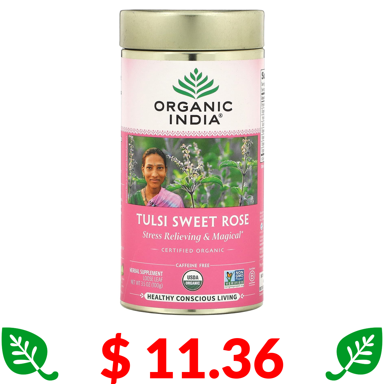 $ 11.36 Organic India, тулсі й солодка троянда, без кофеїну, 100 г (3,5 унції)
