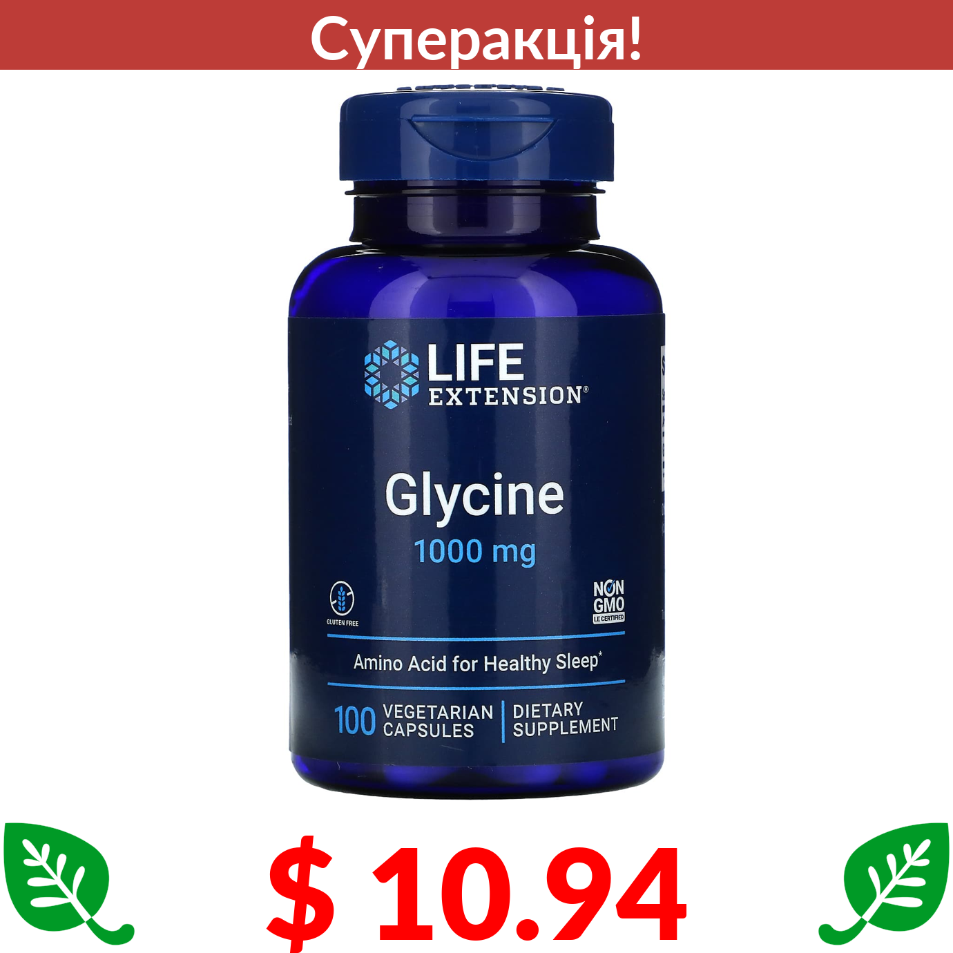 $ 10.94 Life Extension, гліцин, 1000 мг, 100 вегетаріанських капсул