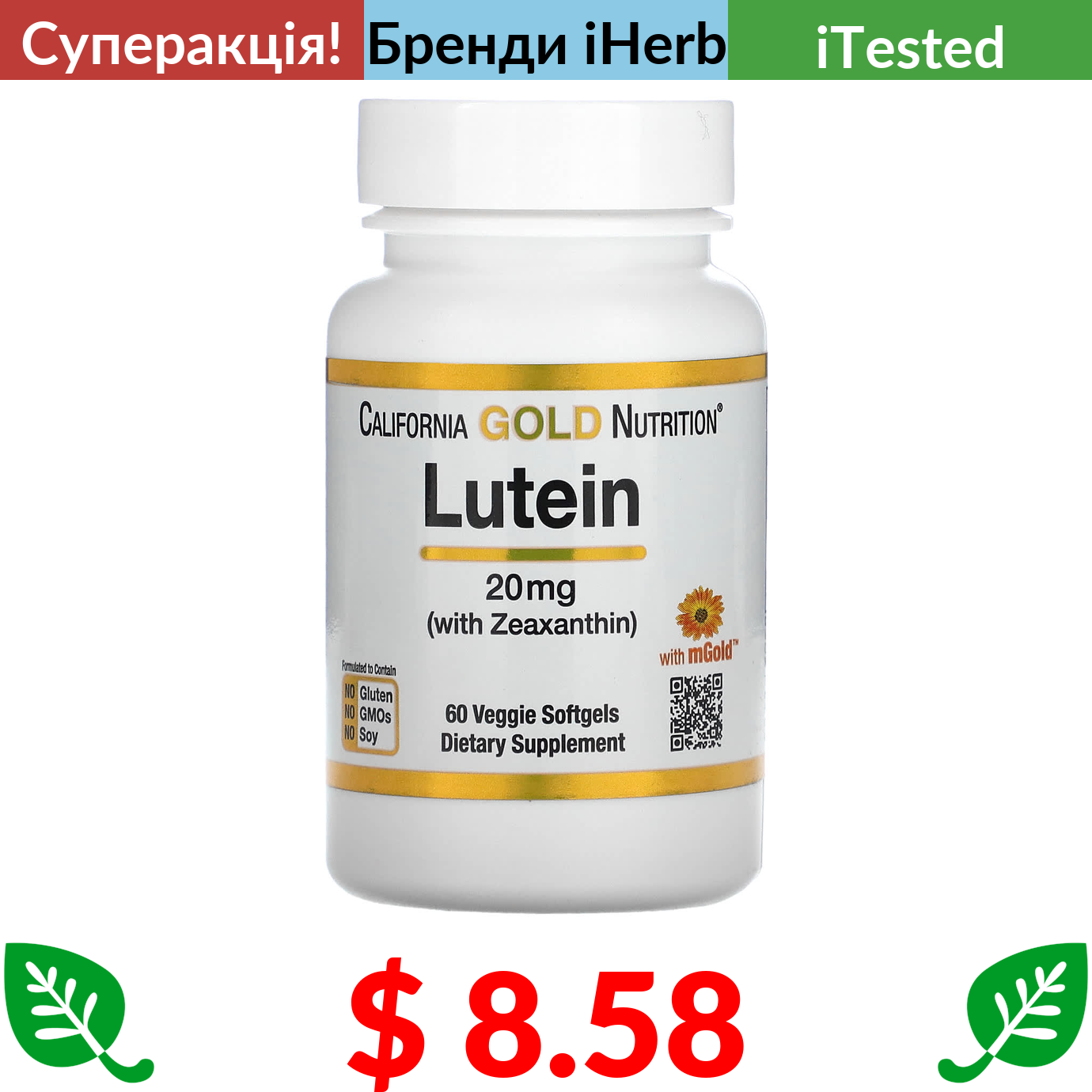 $ 8.58 California Gold Nutrition, лютеїн із зеаксантином, 20 мг, 60 вегетаріанських капсул