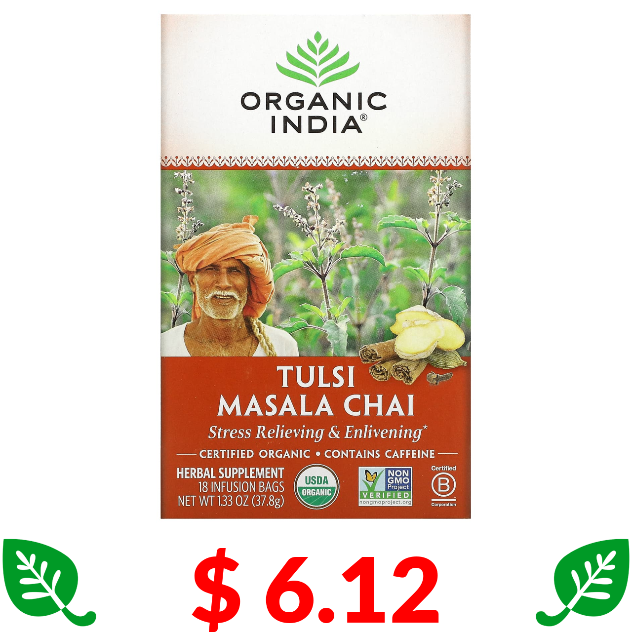 $ 6.12 Organic India, чай масала з тулсі, 18 пакетиків для заварювання, 37,8 г (1,33 унції )