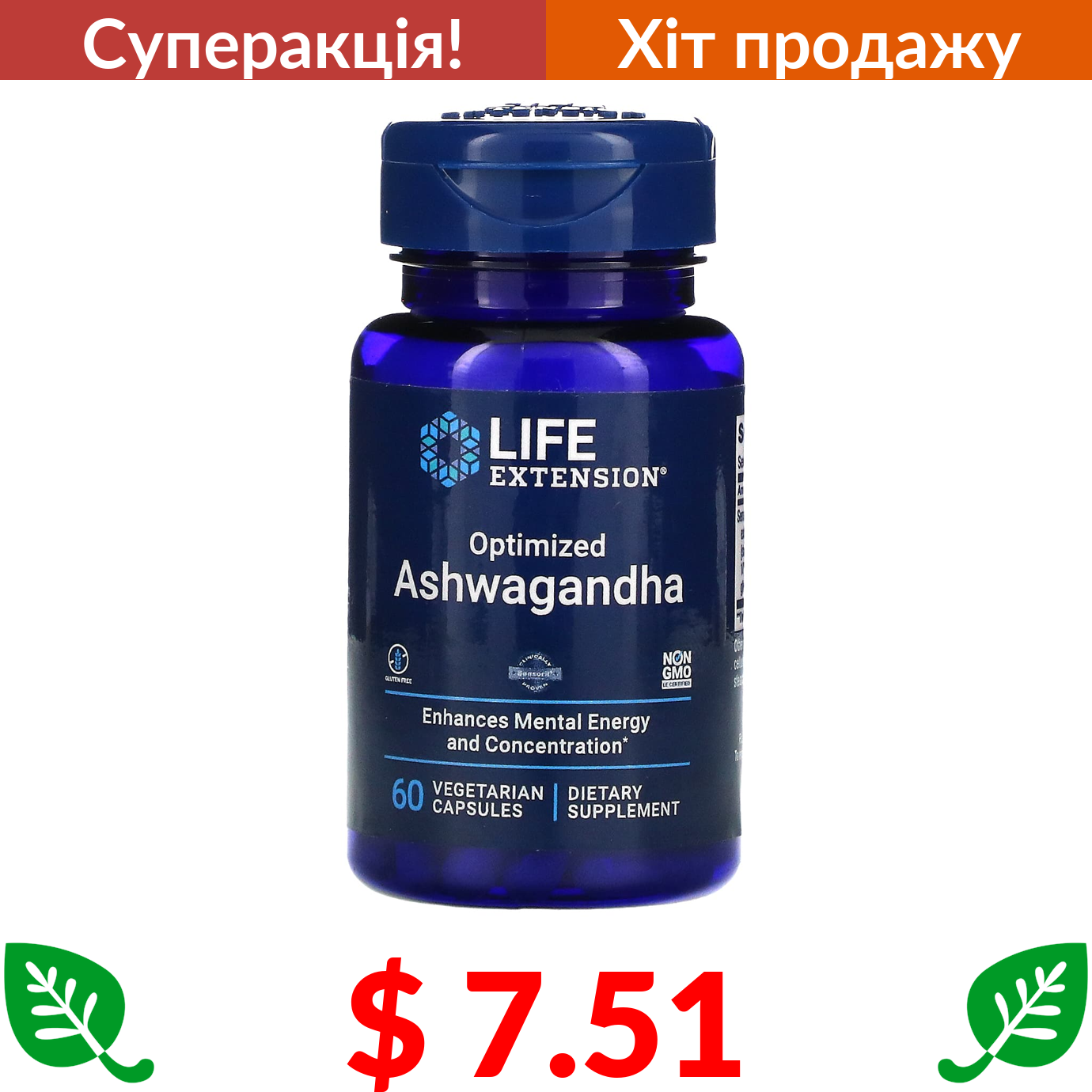 $ 7.51 Life Extension, оптимізована ашваганда, 60 вегетаріанських капсул