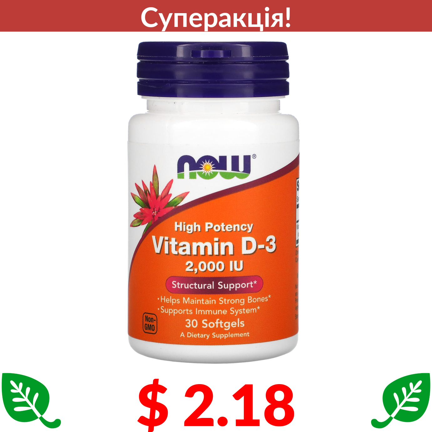 $ 2.18 Now Foods, високоефективний вітамін D3, 50 мкг (2000 МО), 30 капсул