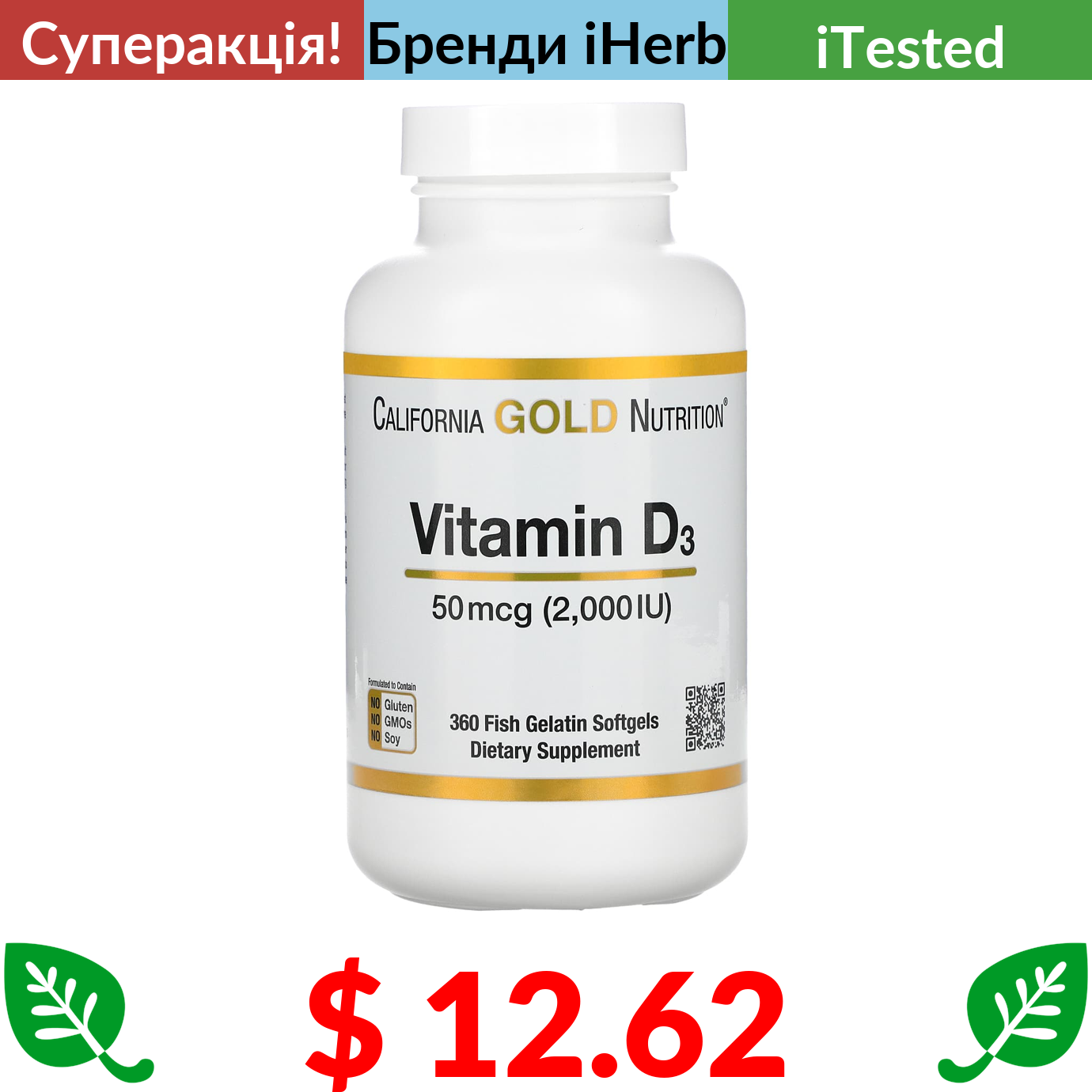 $ 12.62 California Gold Nutrition, вітамін D3, 50 мкг (2000 МО), 360 капсул із риб’ячого желатину
