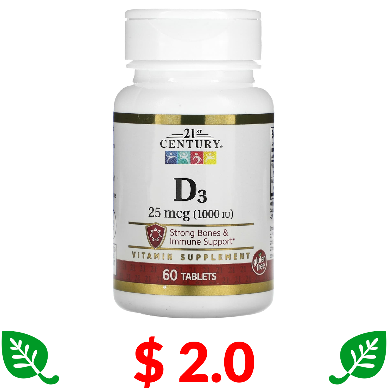 $ 2.0 21st Century, вітамін D3, 25 мкг (1000 МО), 60 таблеток
