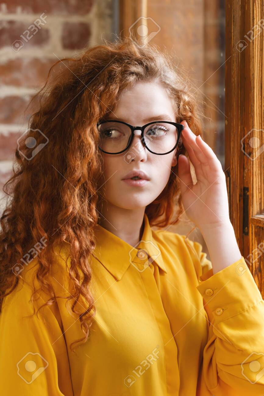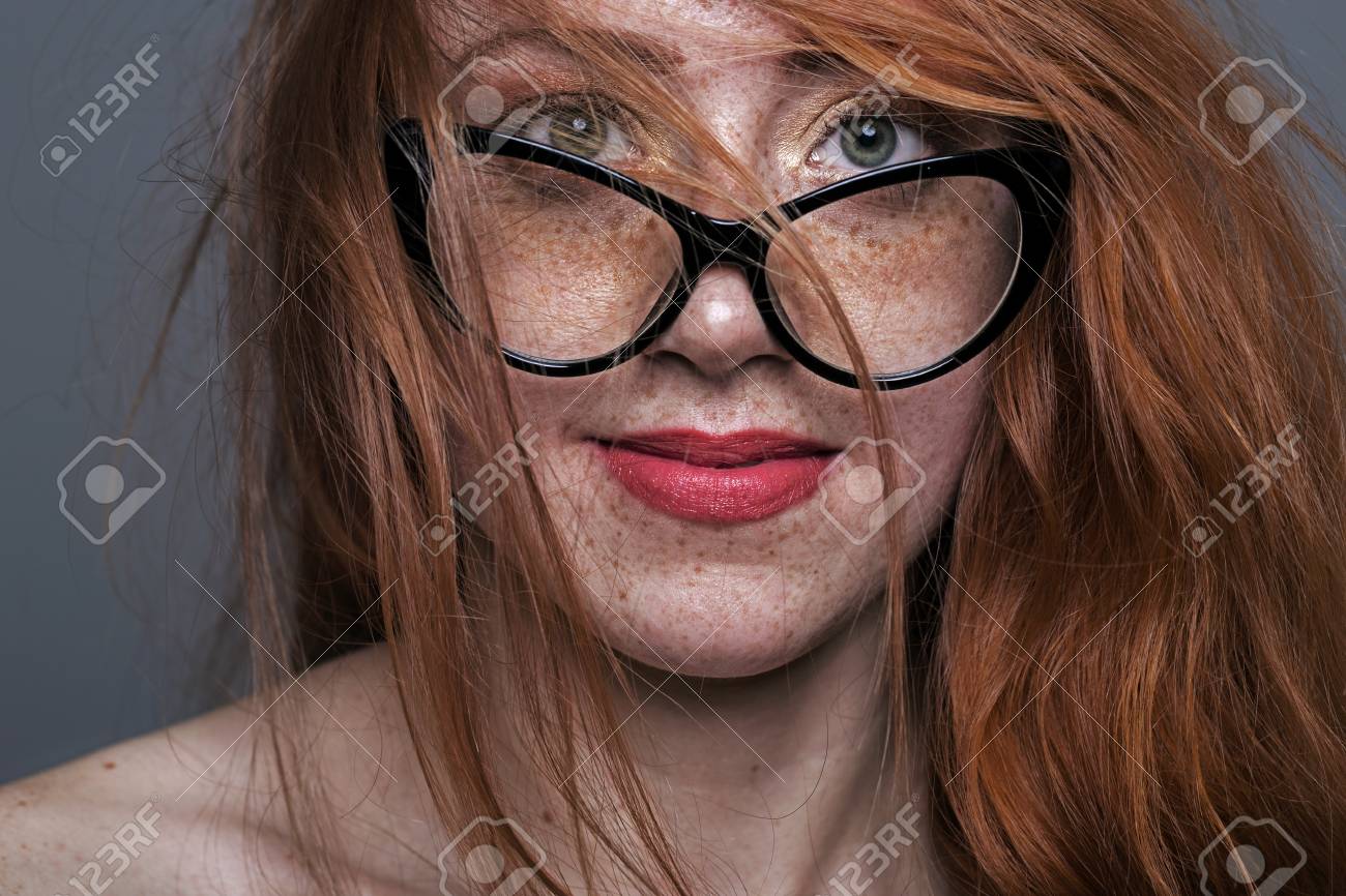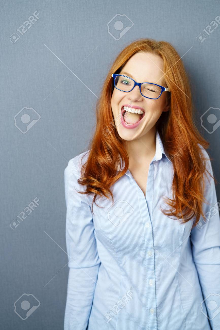 redhead with glasses playing around