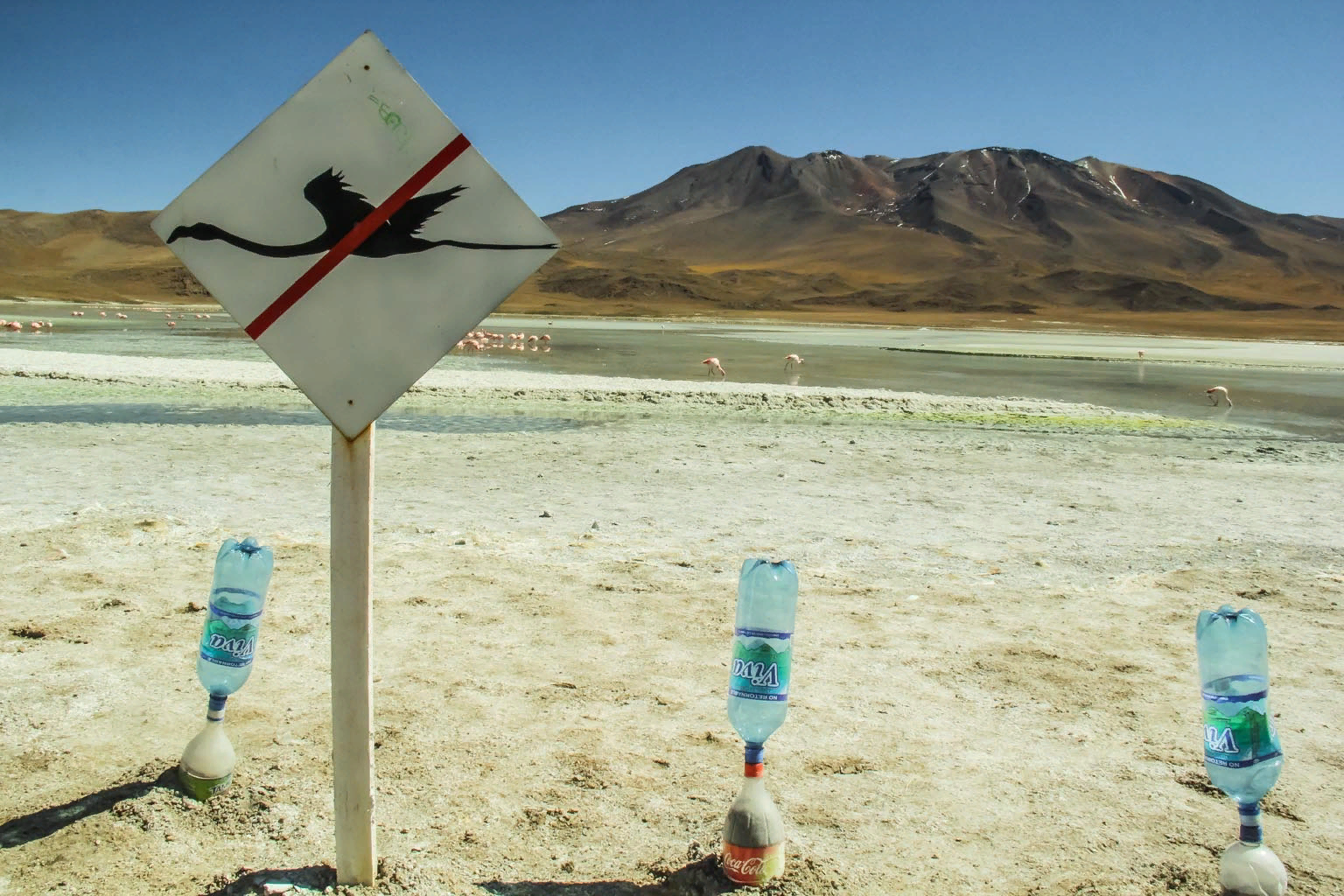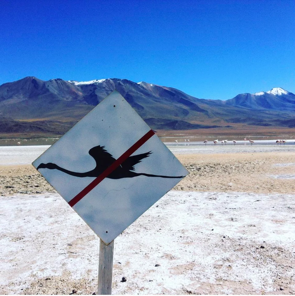 Ответ: Этот знак запрещает подходить к фламинго и пугать их. Некоторые люди делают это, чтобы сфотографировать их в полёте.