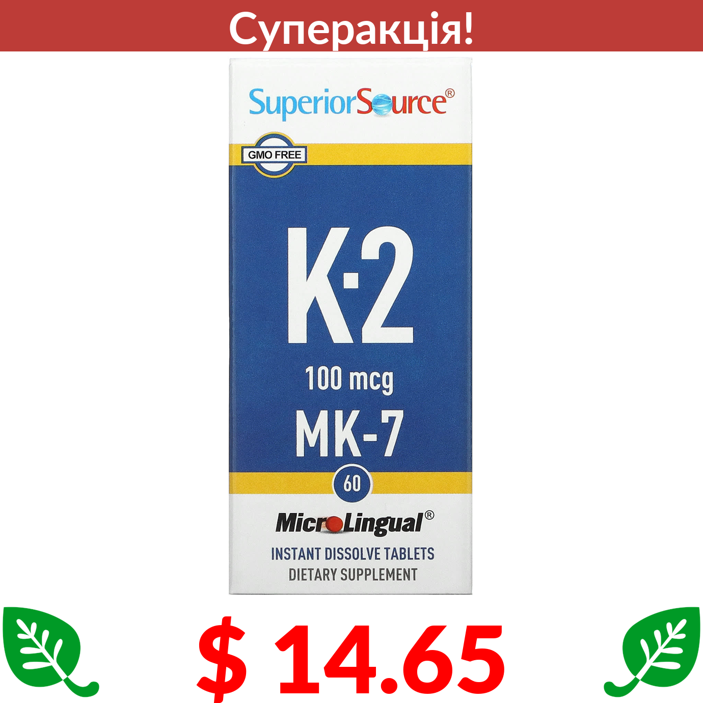 $ 14.65 Superior Source, Вітамін К-2, 100 мкг, 60 мікролінгвальних швидкорозчинних таблеток
