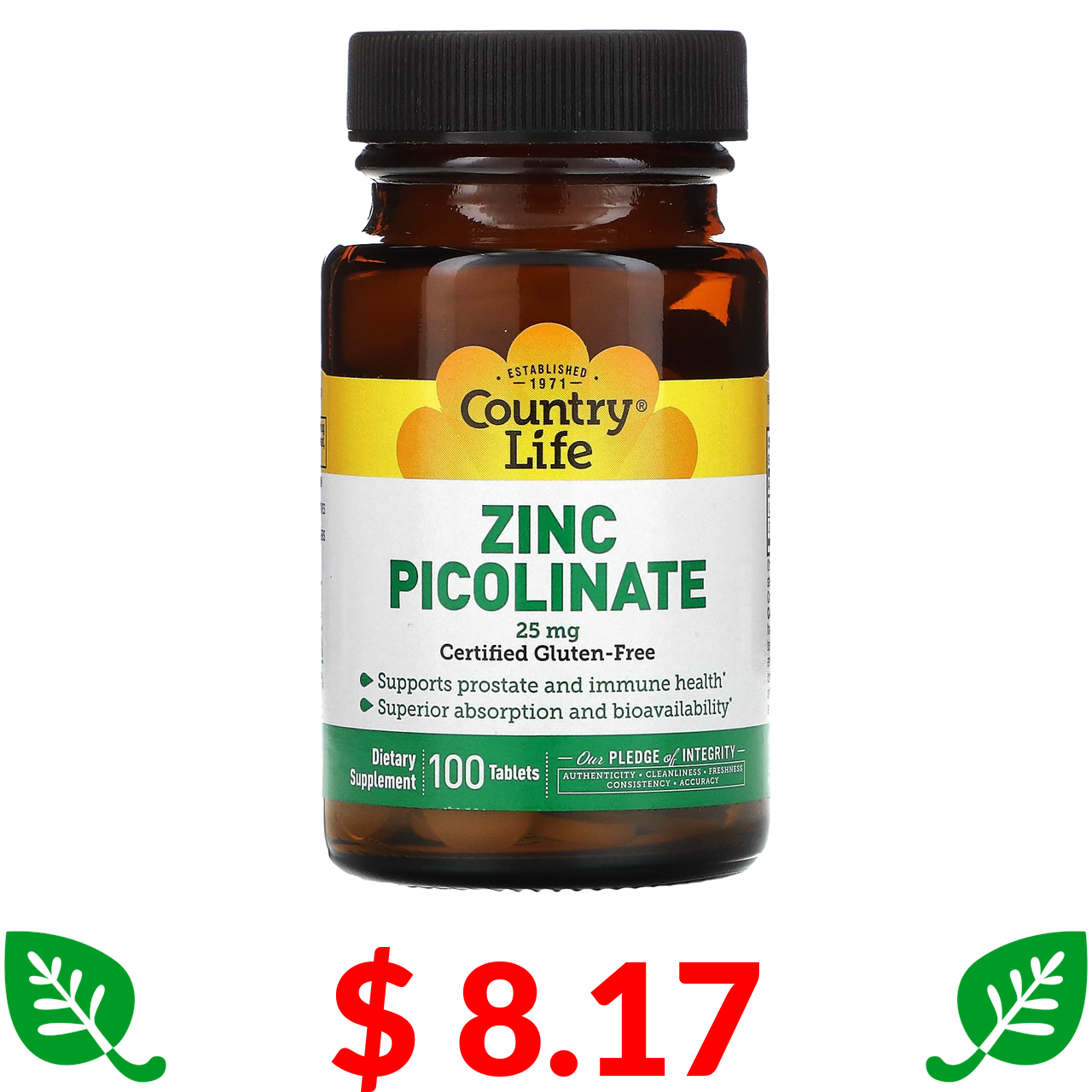 $ 8.17 Country Life, піколінат цинку, 25 мг, 100 таблеток