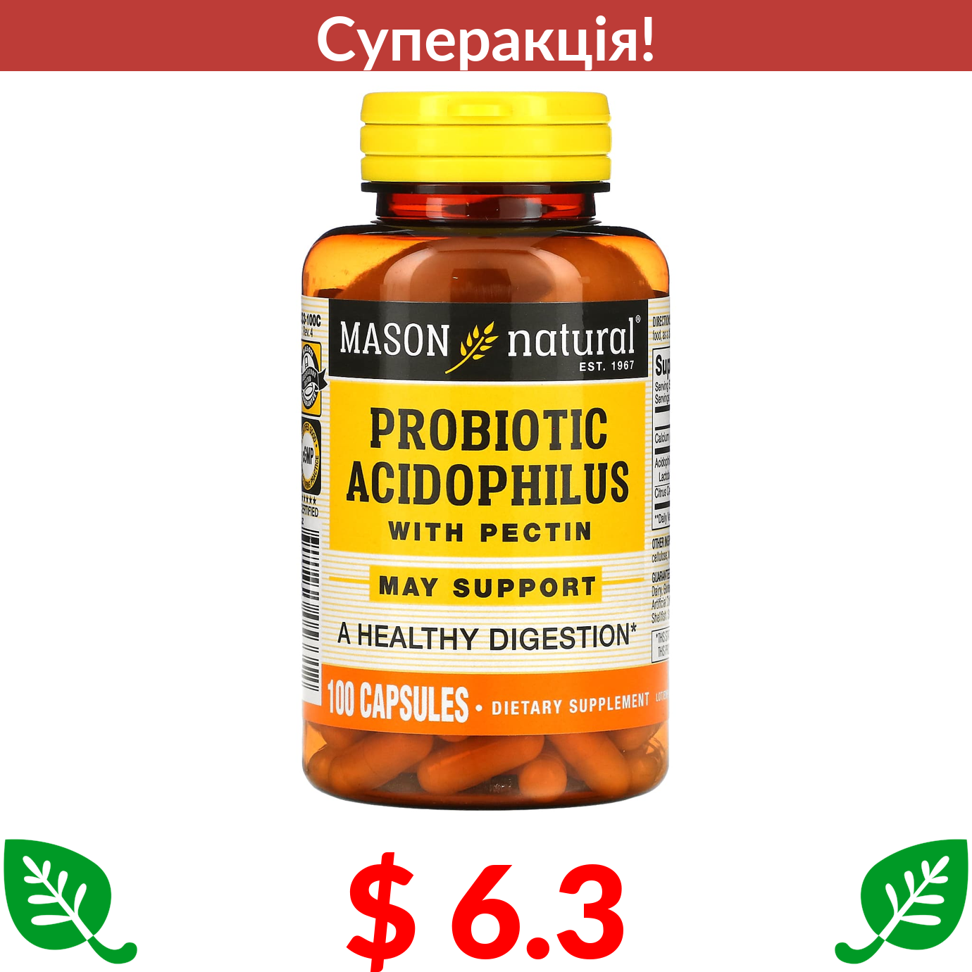 $ 6.3 Mason Natural, пробіотик з ацидофільними лактобактеріями Acidophilus і пектином, 100 капсул
