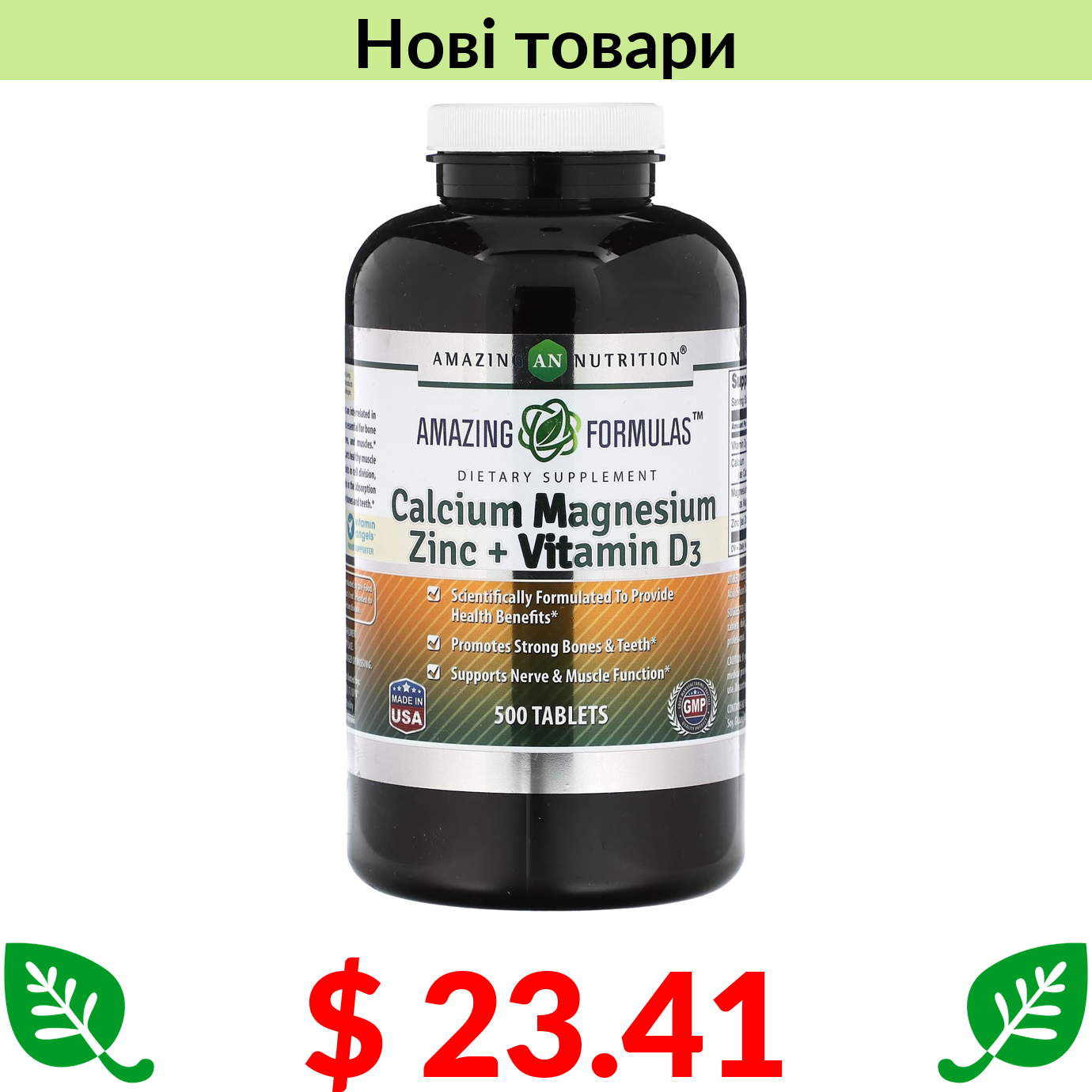 $ 23.41 Amazing Nutrition, Calcium Magnesium Zinc + Vitamin D3, 500 Tablets