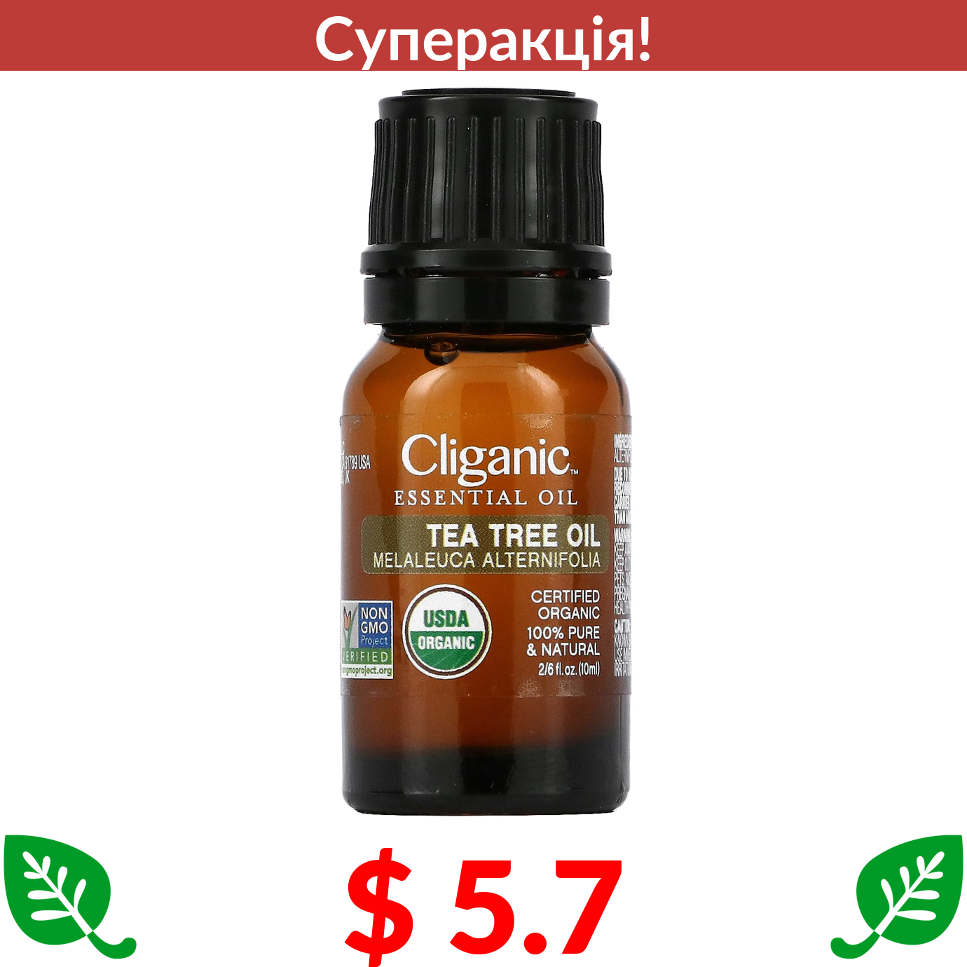 $ 5.7 Cliganic, 100% чиста ефірна олія чайного дерева, 0,33 рідкої унції (10 мл)