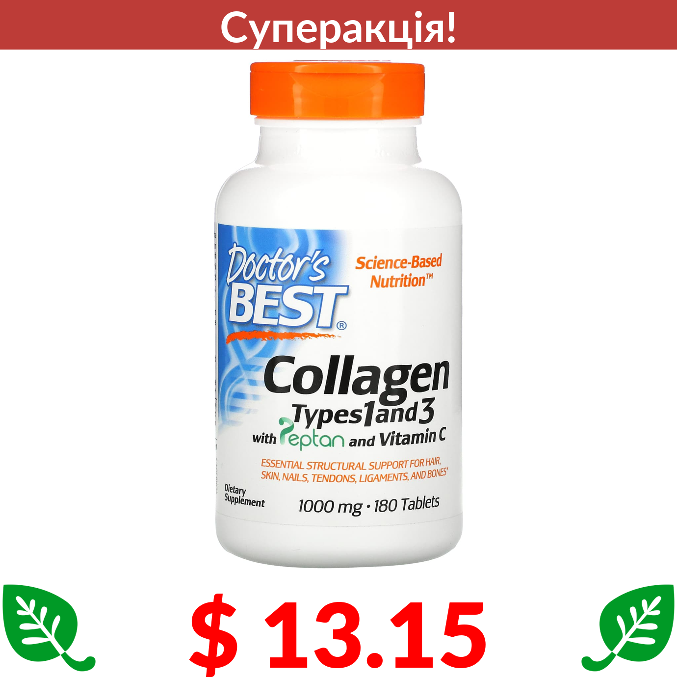 $ 13.15 Doctor's Best, Колаген типів 1 та 3 з пептаном та вітаміном С, 1000 мг, 180 таблеток