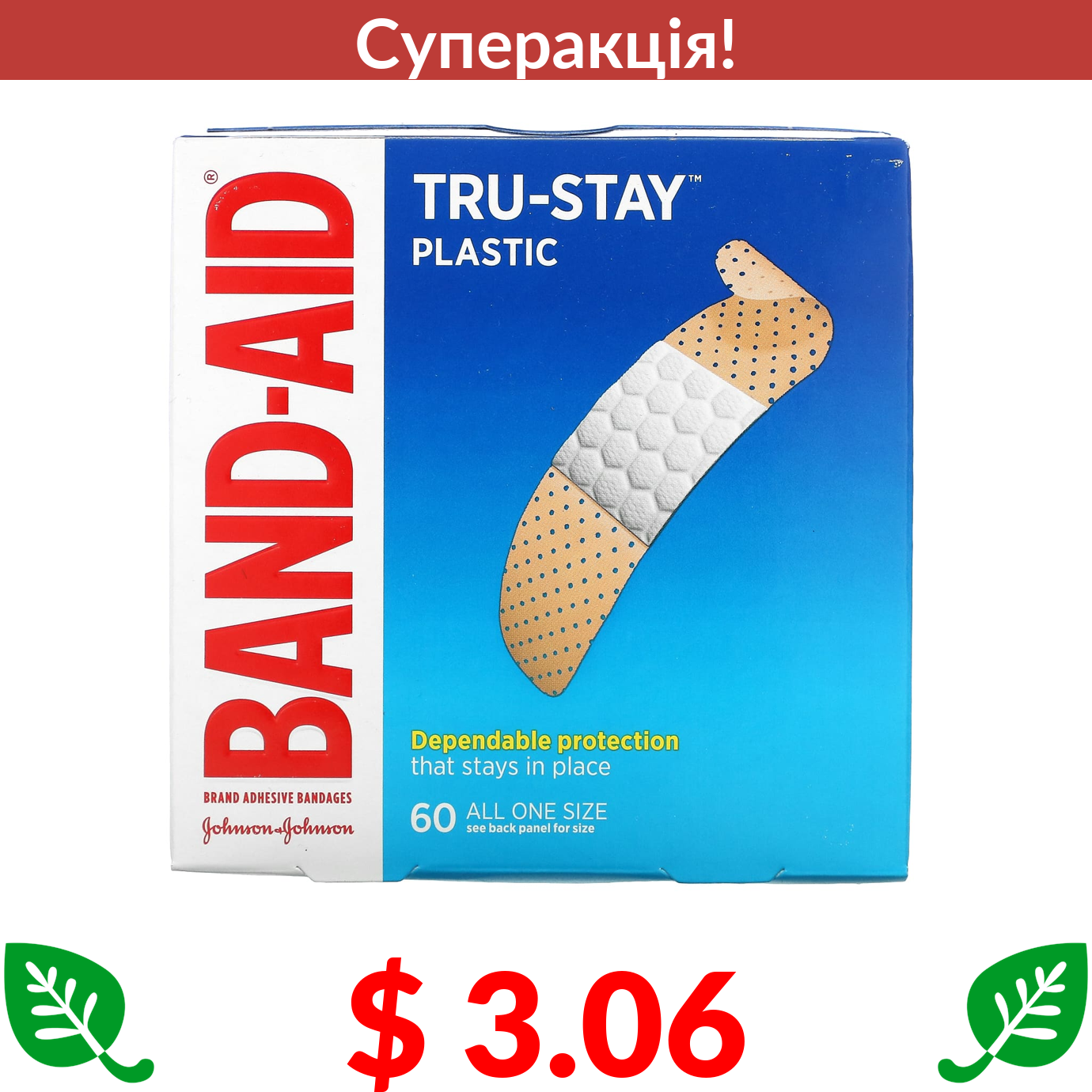 $ 3.06 Band Aid, Tru-Stay, лейкопластир, пластикові смужки, 60 пластирів
