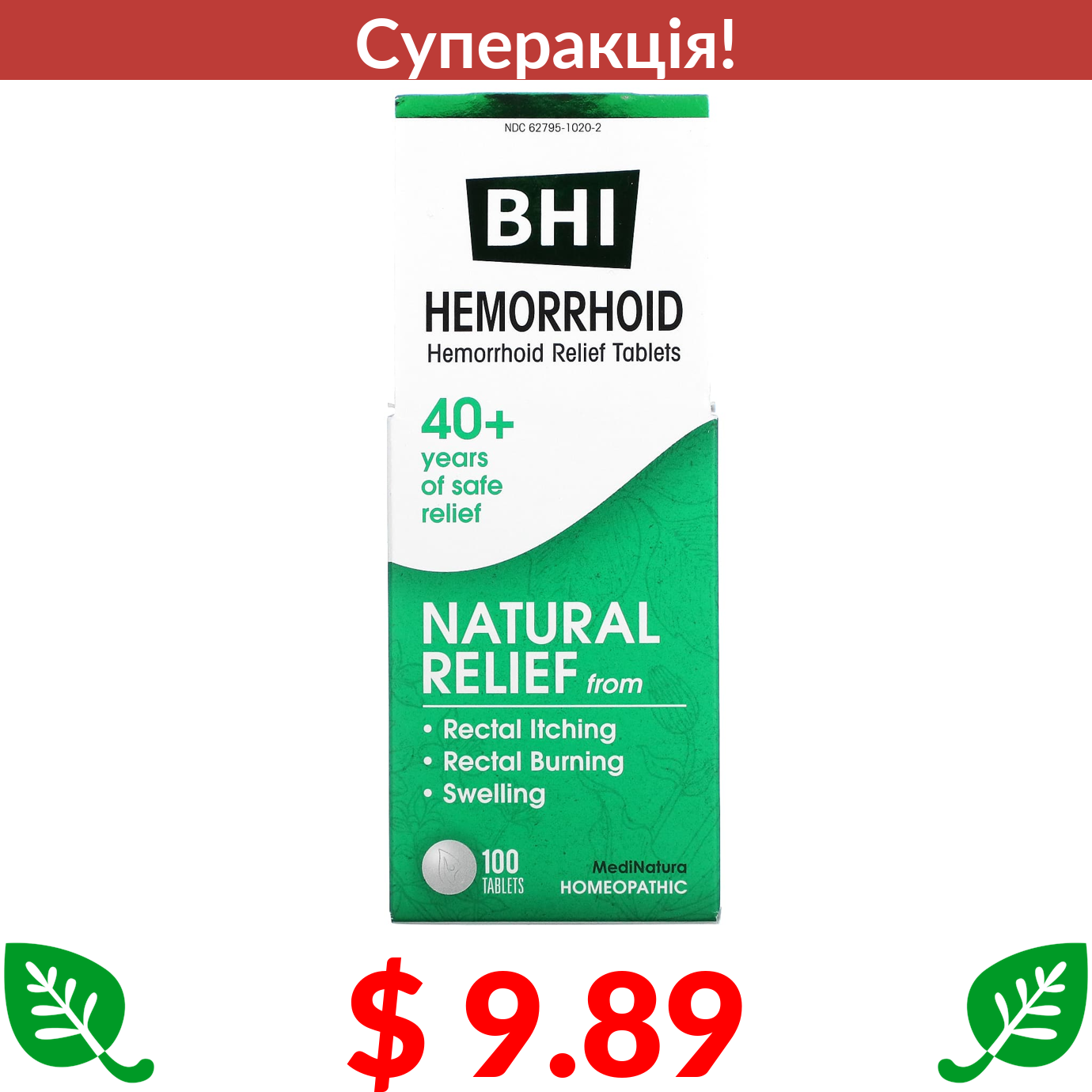 $ 9.89 MediNatura, BHI, засіб від геморою, 100 таблеток