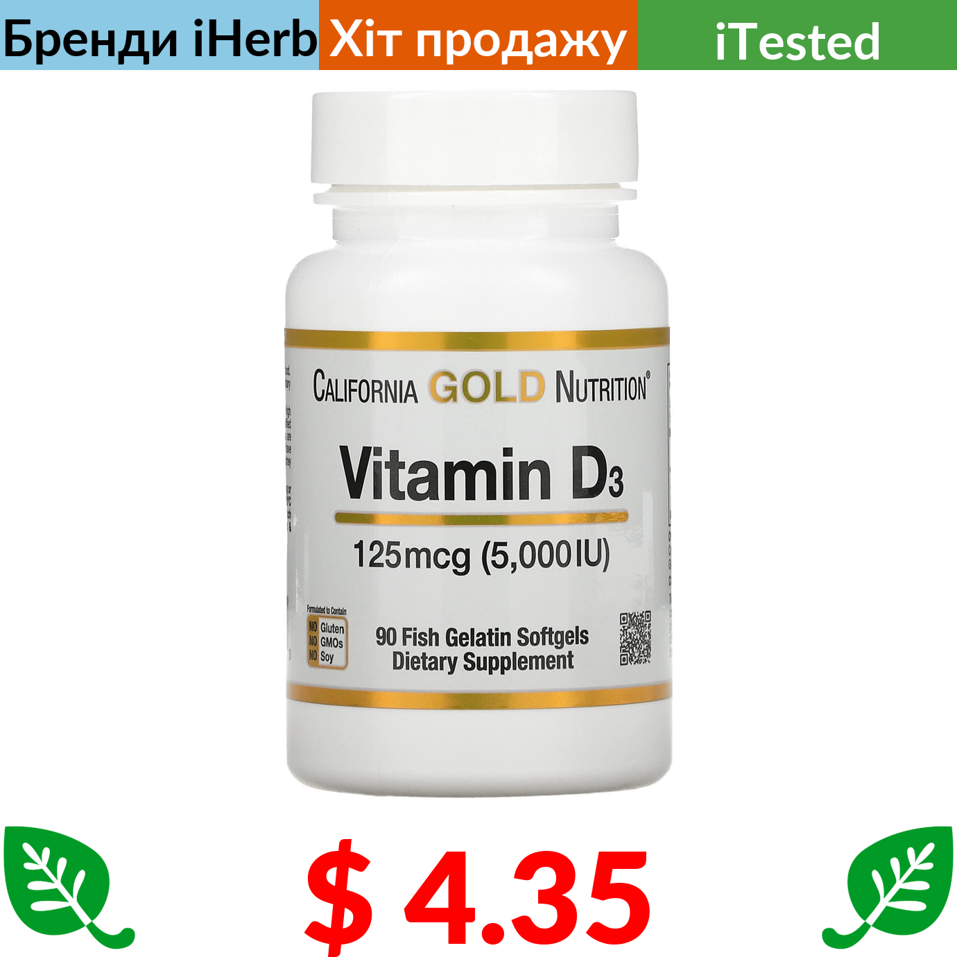 $ 4.35 California Gold Nutrition, вітамін D3, 125 мг (5000 МО), 90 капсул з риб’ячого желатину