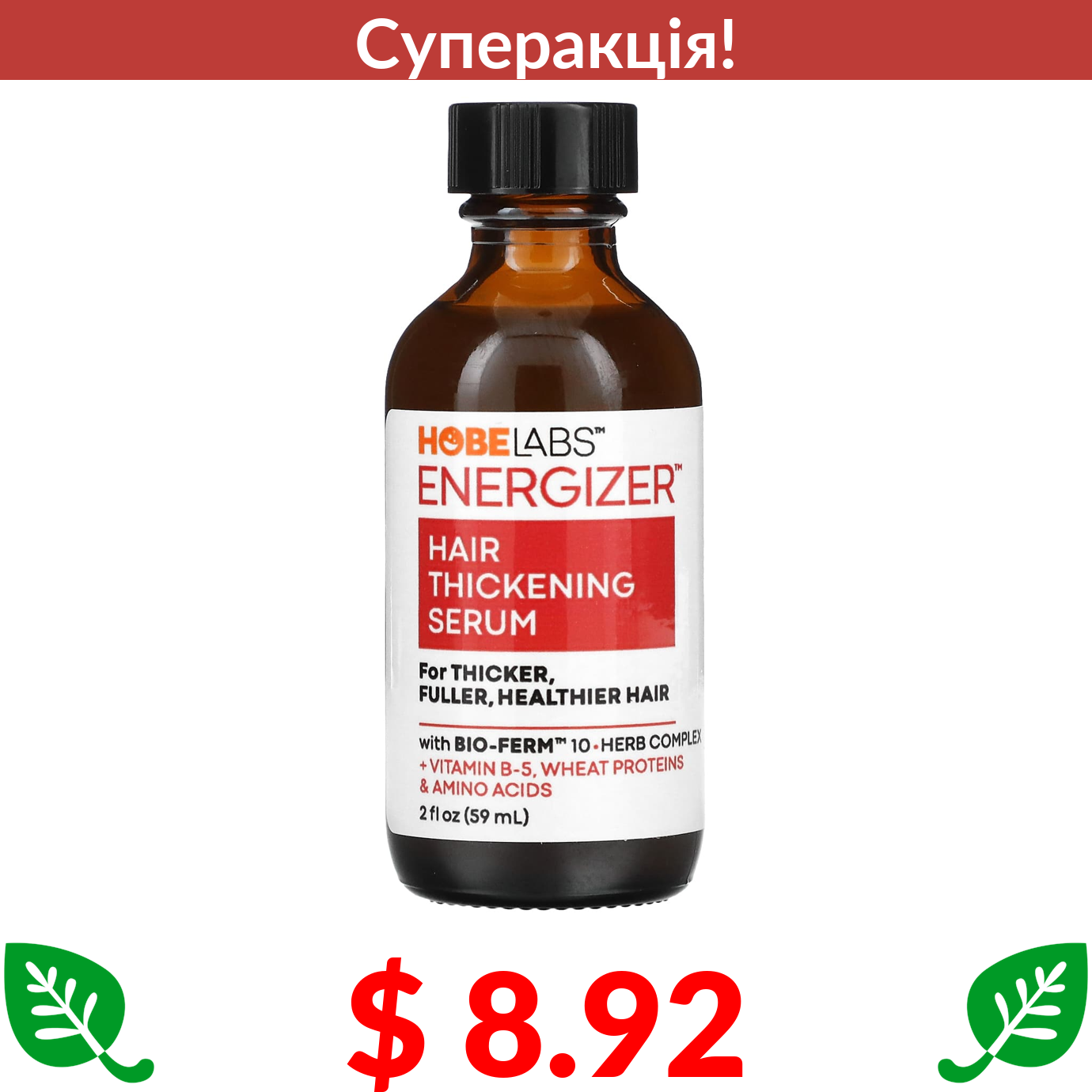 $ 8.92 Hobe Labs, Energizer, сироватка для потовщення волосся, 59 мл (2 рідк. унції)
