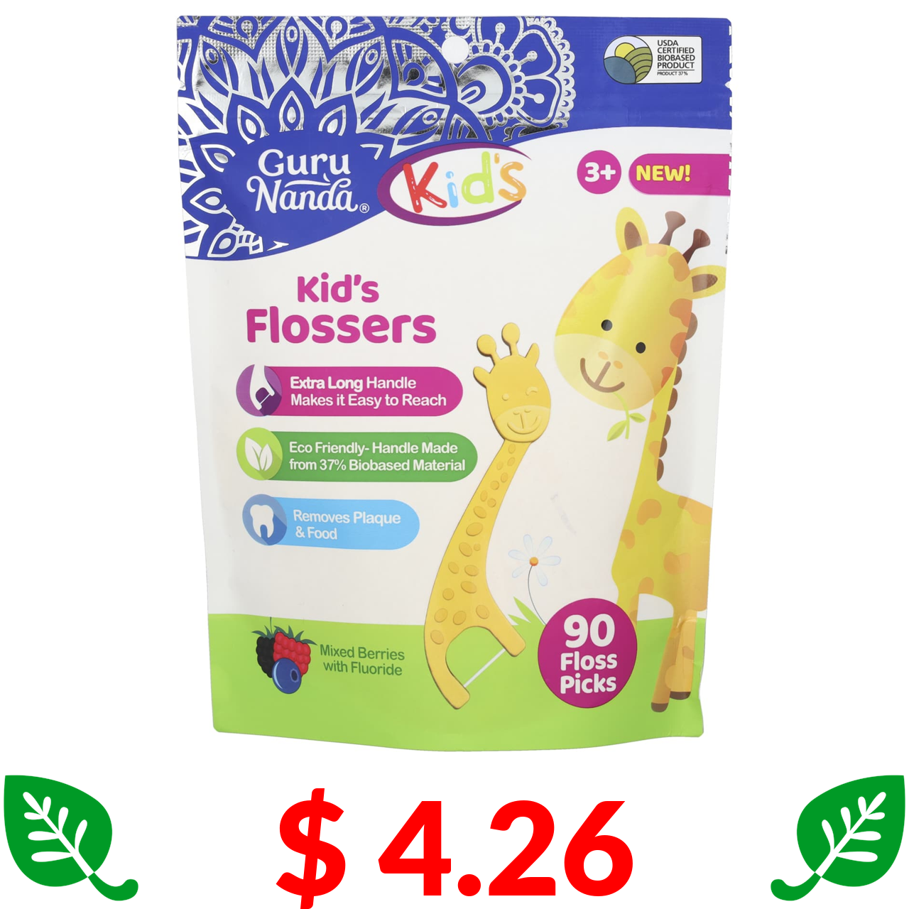 $ 4.26 GuruNanda, дитячі нитки для дітей віком від 3 років, ягідна суміш із фторидом, 90 шт.