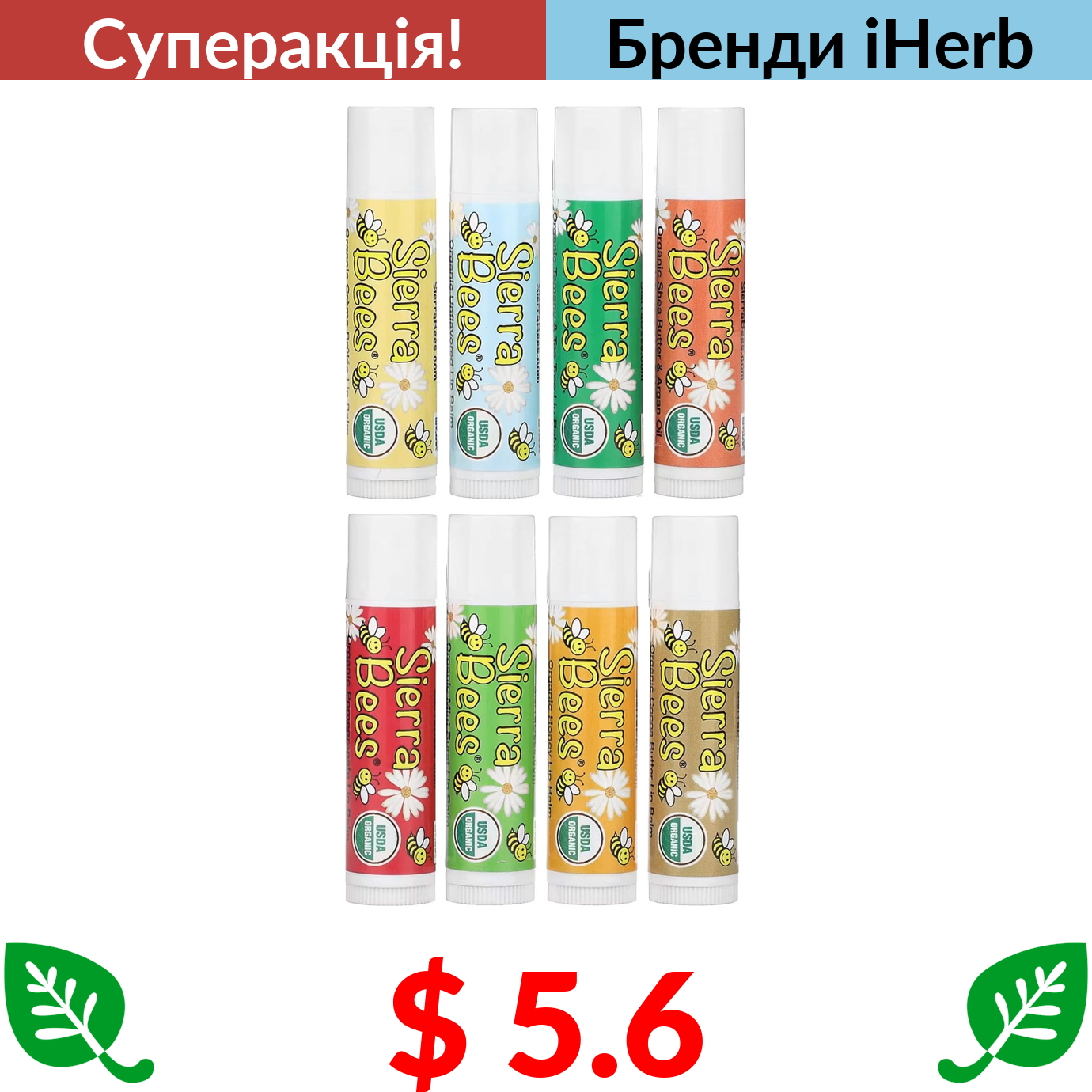 $ 5.6 Sierra Bees, набір органічних бальзамів для губ, 8 шт,. по 4,25 г (0,15 унції)