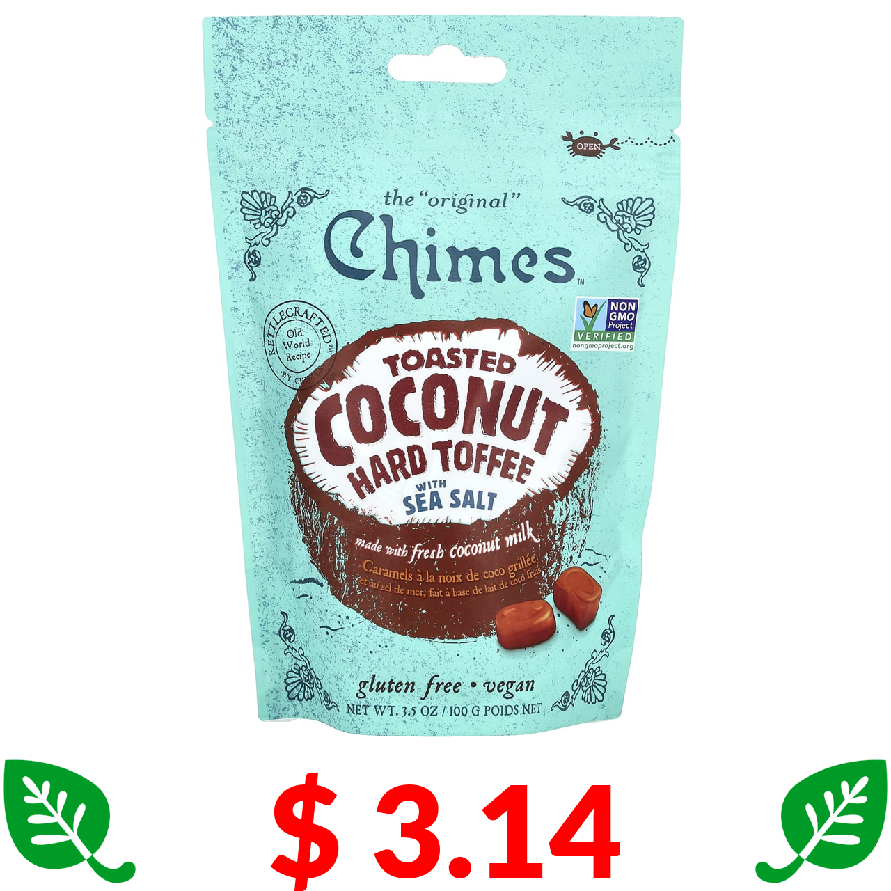 $ 3.14 Chimes, твердий ірис з підсмаженим кокосом і морською сіллю, 100 г (3,5 унції)
