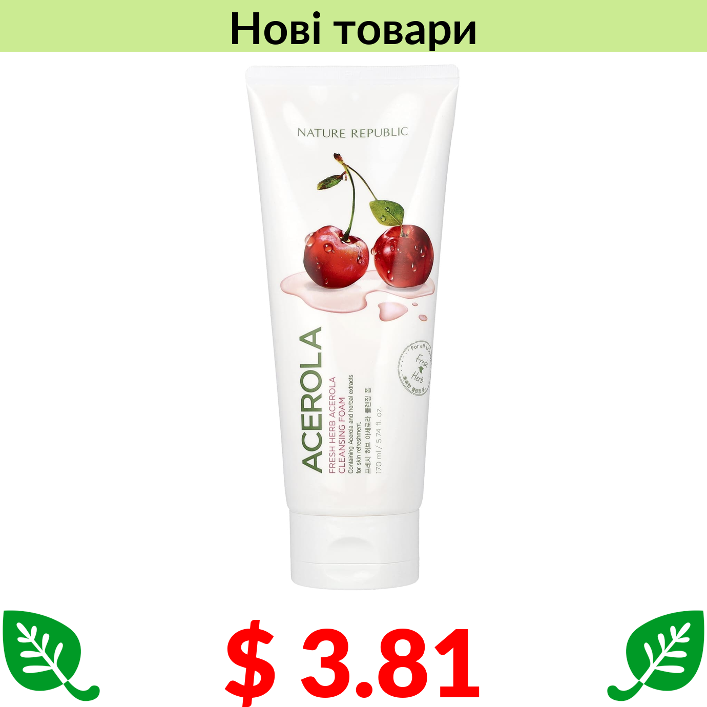 $ 3.81 Nature Republic, Очищувальна пінка зі свіжими травами, ацерола, 170 мл (5,74 рідк. унції)