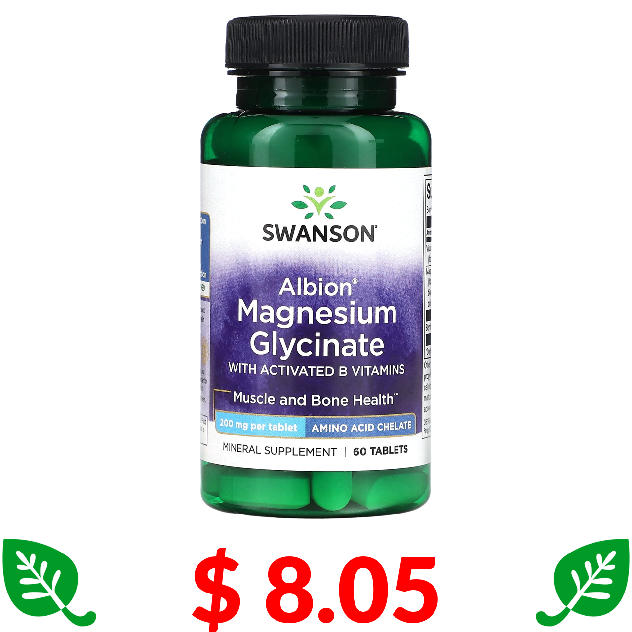$ 8.05 Swanson, Albion, гліцинат магнію з активованими вітамінами групи B, 200 мг, 60 таблеток