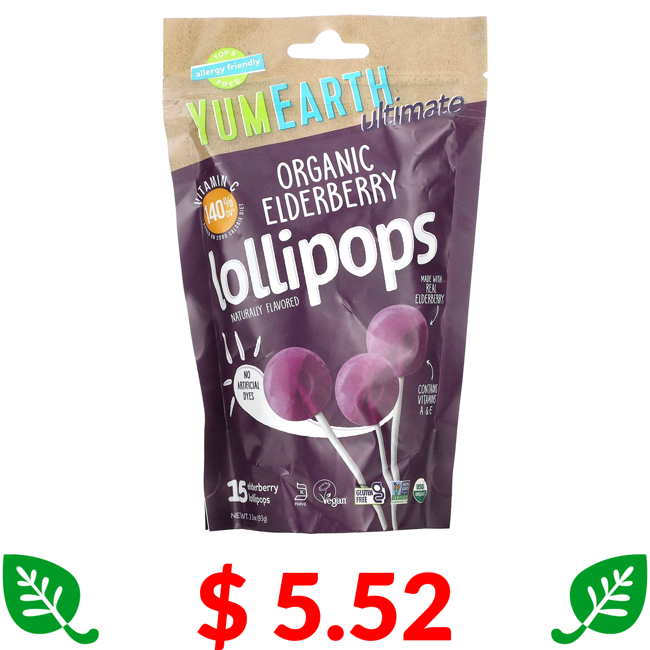 $ 5.52 YumEarth, Ultimate, льодяники з органічної бузини, 15 льодяників, 93 г (3,3 унції)