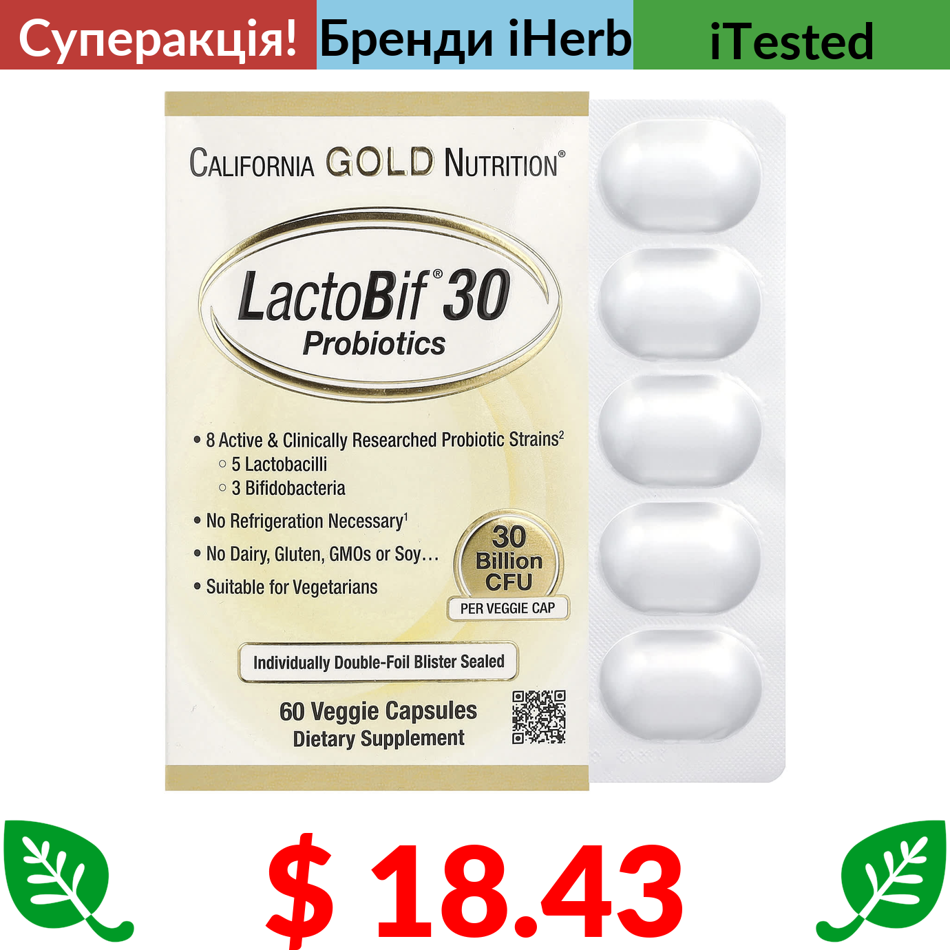 $ 18.43 California Gold Nutrition, LactoBif 30, пробіотики, 30 млрд КУО, 60 вегетаріанських капсул