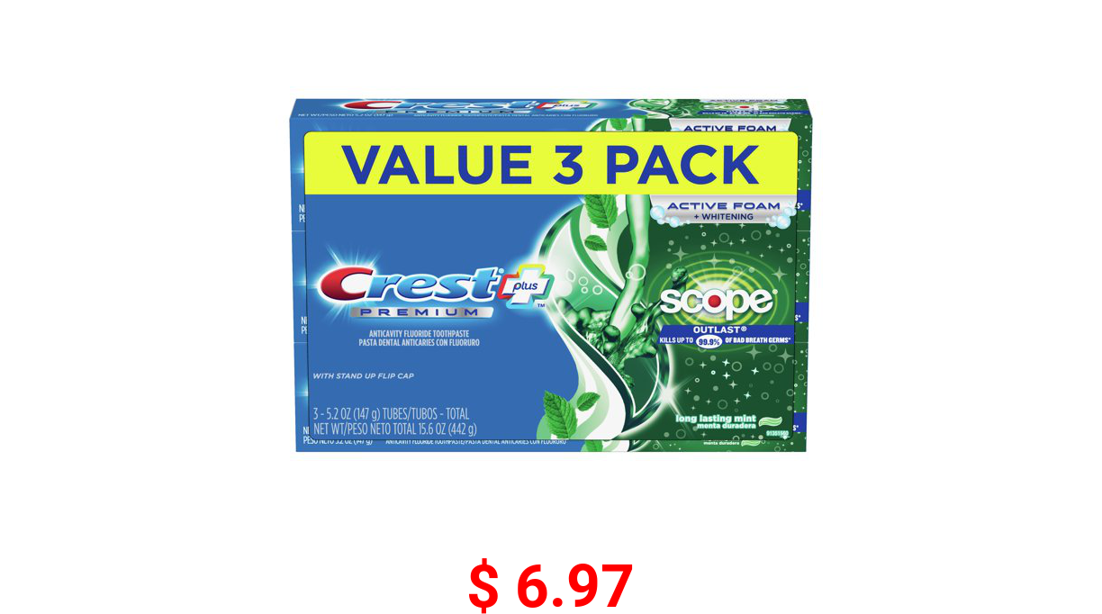 π° $ 6.97 Crest Premium Plus Scope Outlast Toothpaste, Mint, 5.2 Oz, 3 Pack