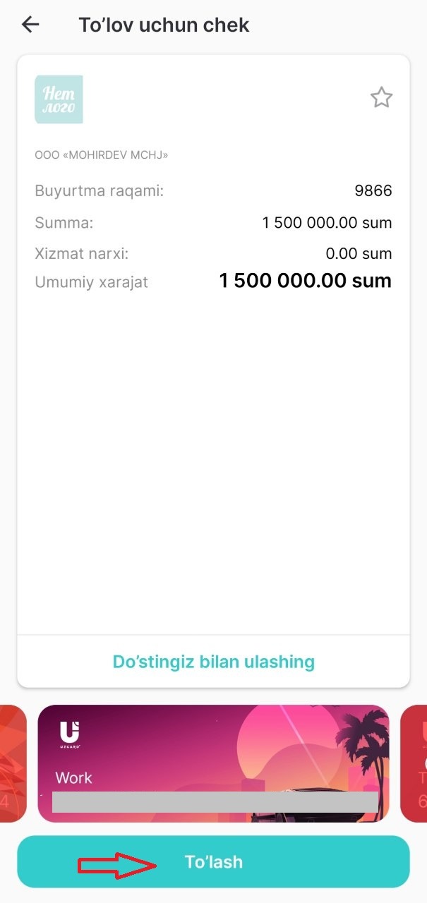 7-qadam. Barchasini to'g'ri bajarganingizdan so'ng, "To'lov qilish" tugamasini bosasiz.