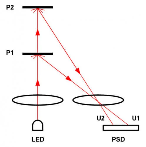 Принцип работы оптического датчика Sharp заключается в том, что лазерный луч отражается от препятствия и попадает на матрицу в разные её места, в зависимости от того, на каком расстоянии произошло отражение.