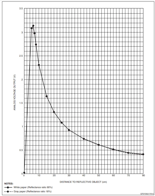 Выход датчика нелинеен. Зависимость показаний датчика от расстояния имеет следующий вид: