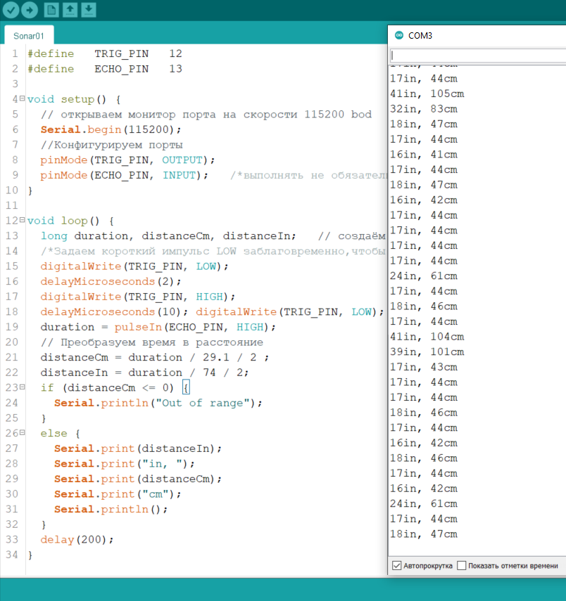 На стороне ардуино обработка времени высокого сигнала от Echo обеспечивается командой pulseIn(Pin,High). Эта функция работает на прерываниях программных прерываниях ардуино, и принимает в качестве аргументов номер пина, на котором отслеживается изменение уровня, и уровень - HIGH или LOW