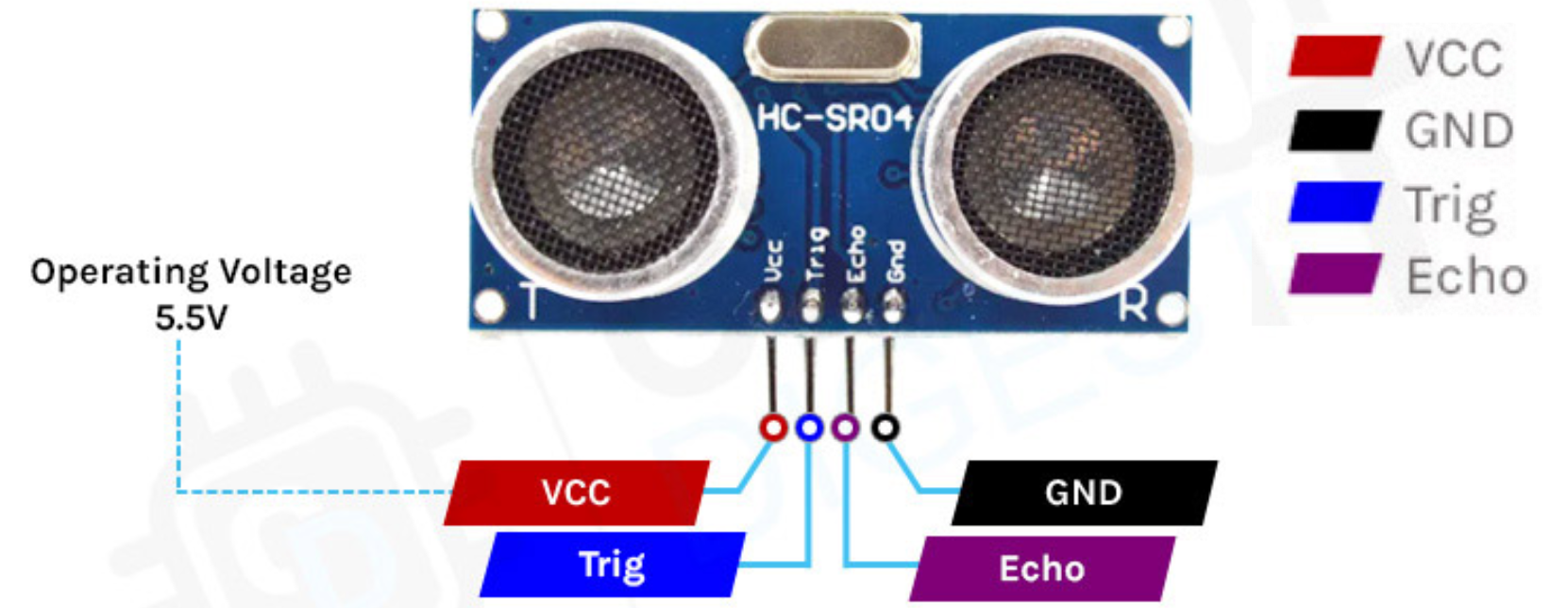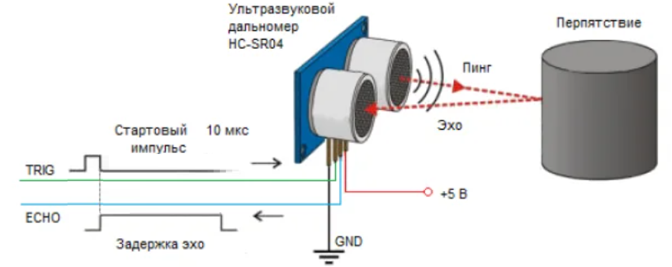 Модуль HY-SRF05 при получении импульса от ардуино запускает работу встроенного контроллера, который формирует несколько ультразвуковых импульсов, которые излучаются с динамика "Т". После отражения от объекта - эхо возвращается на приёмник "R". Встроенный контроллер определяет время между отправкой первого фронта и приходом отраженного фронта. Полученное значение времени соответствует сигналу HIGH на пине Echo, который формирует контроллер датчика.