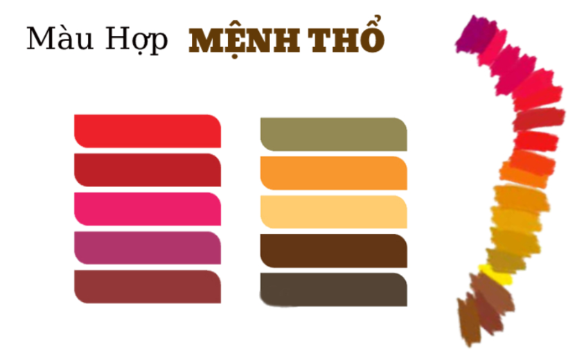 Tương sinh: Hỏa sinh Thổ, Kim sinh Thổ → màu đỏ, cam, hồng (Hỏa) và trắng, ghi, xám (Kim).