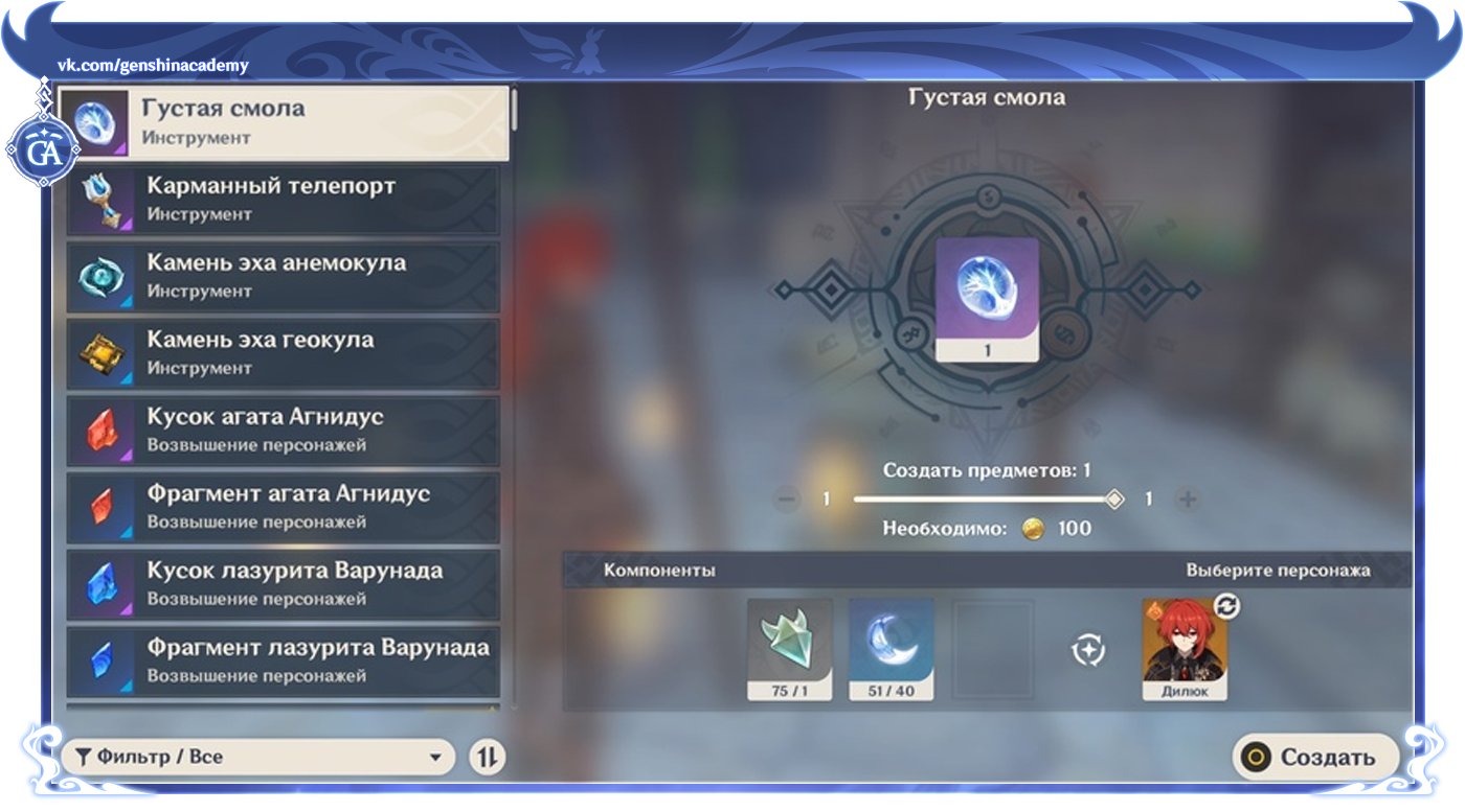 скрафтить густую смолу в геншин