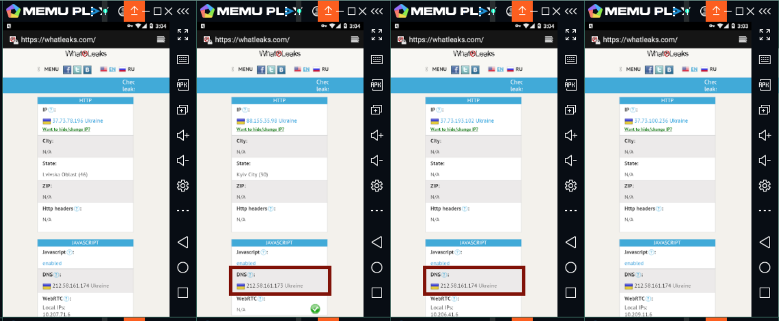 Вдаваться в детали в рамках этого мануала пока не буду - будет спрос, ВОЗМОЖНО опишу как сделать правильно. Кому интересно - вот пример. На каждом эмуляторе DNS берется именно от провайдера, который предоставляем вам IP. Он не прописывается в таблицах (просто не заработает), не меняется каким-либо еще образом, а берется непосредственно из соединения, и мало того, еще и динамически изменяется в зависимости от текущего операторского IP. (смотрите на различие DNS, обведено красным)