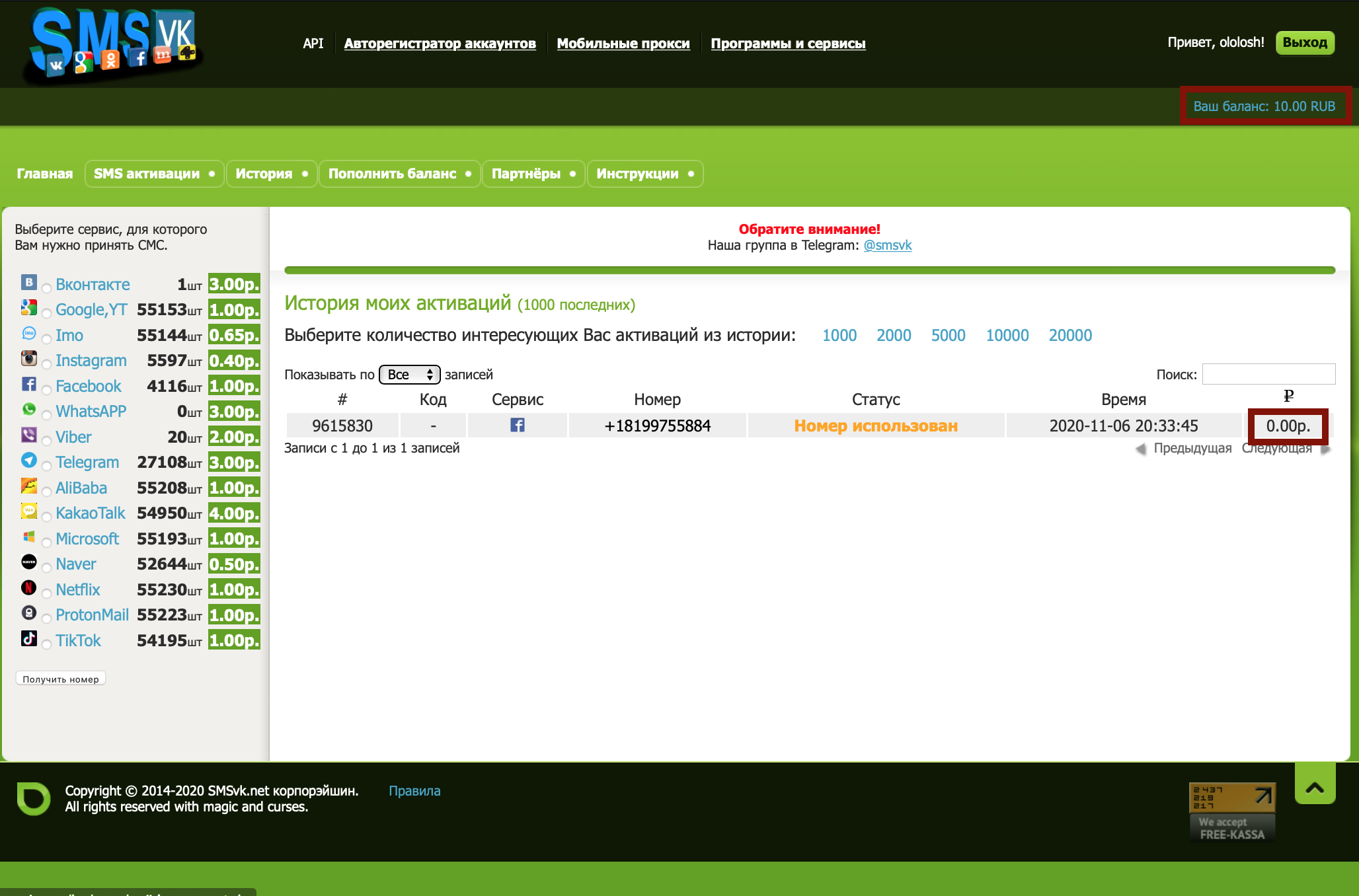 - При заказе номера - на балансе "замораживается" сумма, равная стоимости активации данного сервиса (скрин выше - мы выбрали Facebook, стоимость аренды 1 ₽. На данную сумму уменьшился ваш баланс